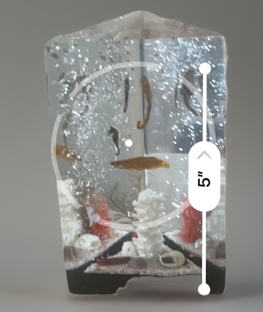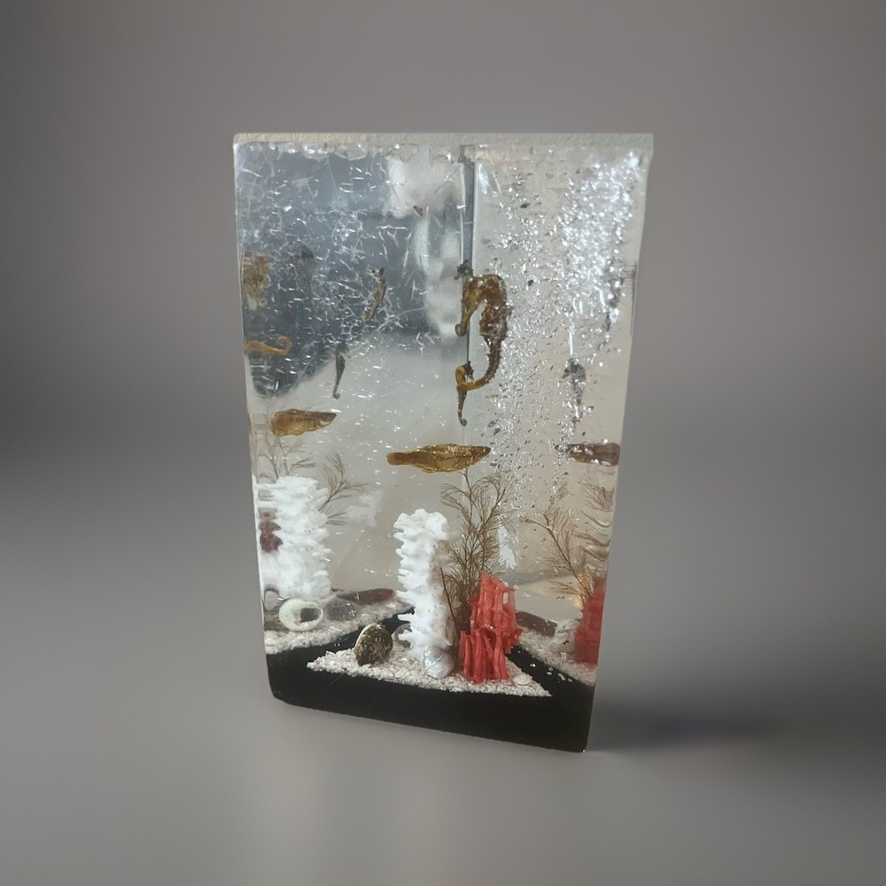This vintage Lucite ocean beach decor diorama features a unique design of shells, sea fish, and horseshoe-shaped objects, all beautifully embedded within a clear Lucite material. Handmade in the United States, this decorative collectible piece adds a touch of nostalgia and charm to any space. Perfect for collectors or those looking to add a whimsical accent to their home or office decor, this paperweight is a one-of-a-kind conversation piece that celebrates the beauty of the ocean and the sea.