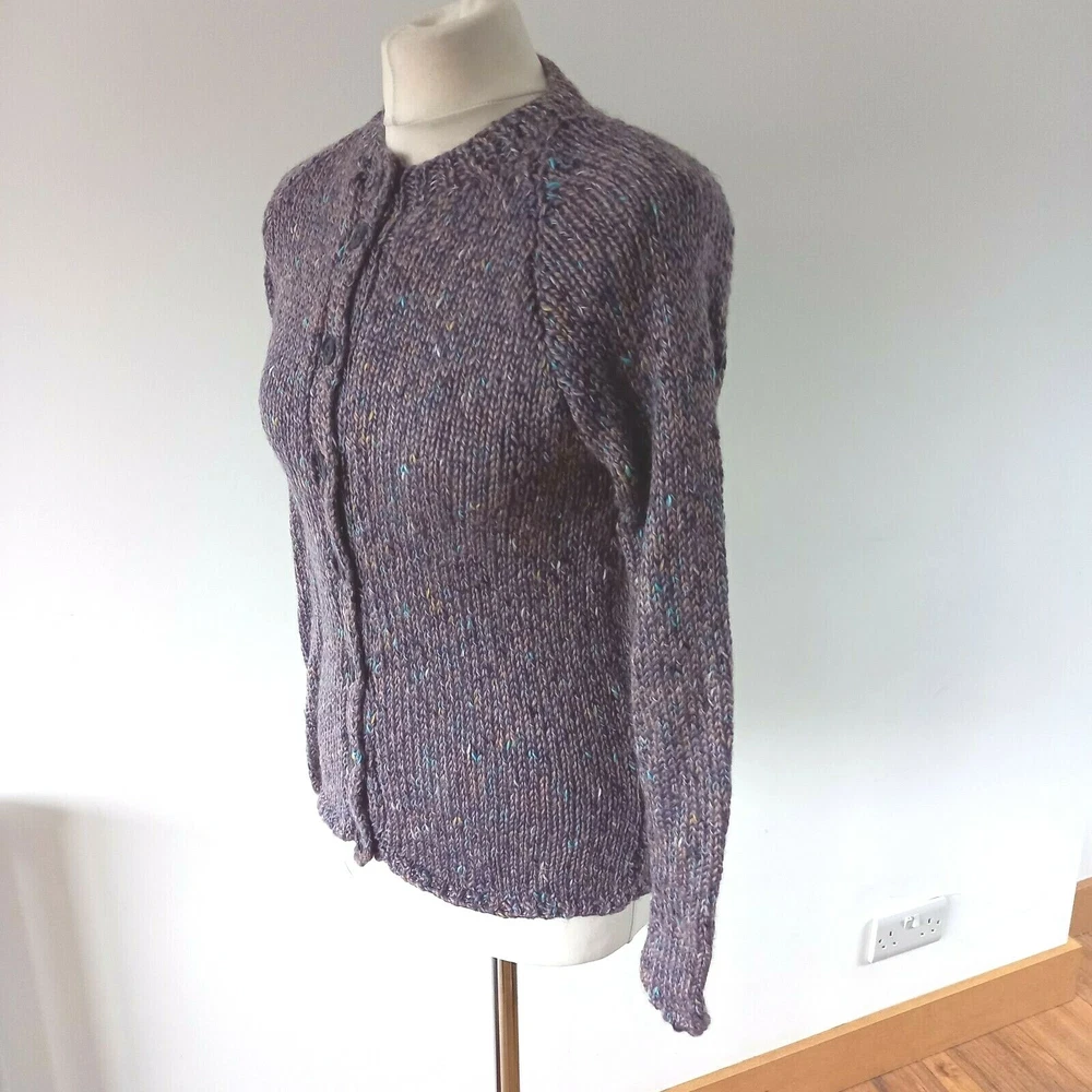 Gently used vintage condition with no faults found. Cardigan in a soft yarn with purple as main colour but also other colours running through it. Higher neck. Measures 18" pit to pit, 16" across hip area approx, , length nape to hem 25" with a bit of roll up at the hem, sleeve 24". Unsure of yarn content but is soft and has some mohair in it.