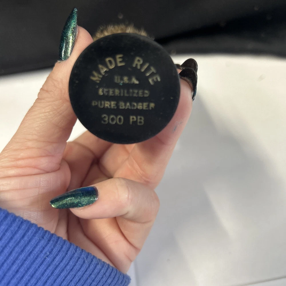 This vintage shaving brush is a must-have for any collector or lover of classic grooming items. Made in the United States, this brush features the iconic "MADE RITE USA 300PB" marking, adding to its unique charm. Its bristles are perfect for a comfortable and effective shave, while its handle provides a sturdy grip for easy use. This item is a great addition to any vanity or collection, and is sure to make a statement. Don't miss out on the opportunity to own a piece of grooming history! Item sold as is See photos on condition Complete
