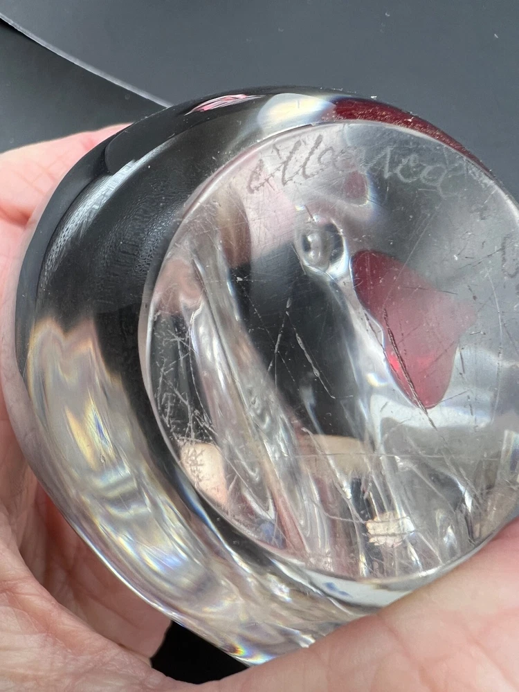 This beautiful figurine from Marcolin is a stunning piece of art glass. When two hearts become one. Hand-blown and signed by the artist, it features two birds sharing one heart in clear glass. The Scandinavian origin and incised backstamp add to the charm of this piece, which would make a wonderful addition to any collection. The production style and technique of this piece is truly impressive, with every detail of the birds and heart carefully crafted. The colors, though limited to clear glass, create a sense of peace and harmony. Add this unique piece to your collection today! The size is about 4 x 4 inches I will pack with care and get it to you ASAP Thanks for looking !