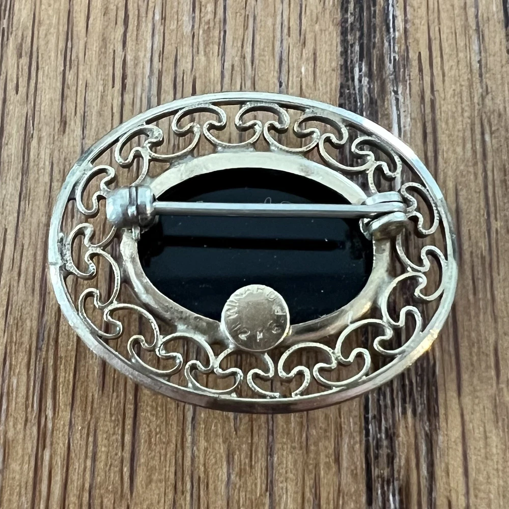 VINTAGE MARKED WINARD 12K GOLD FILLED OVAL ONYX FILIGREE PIN BROOCH