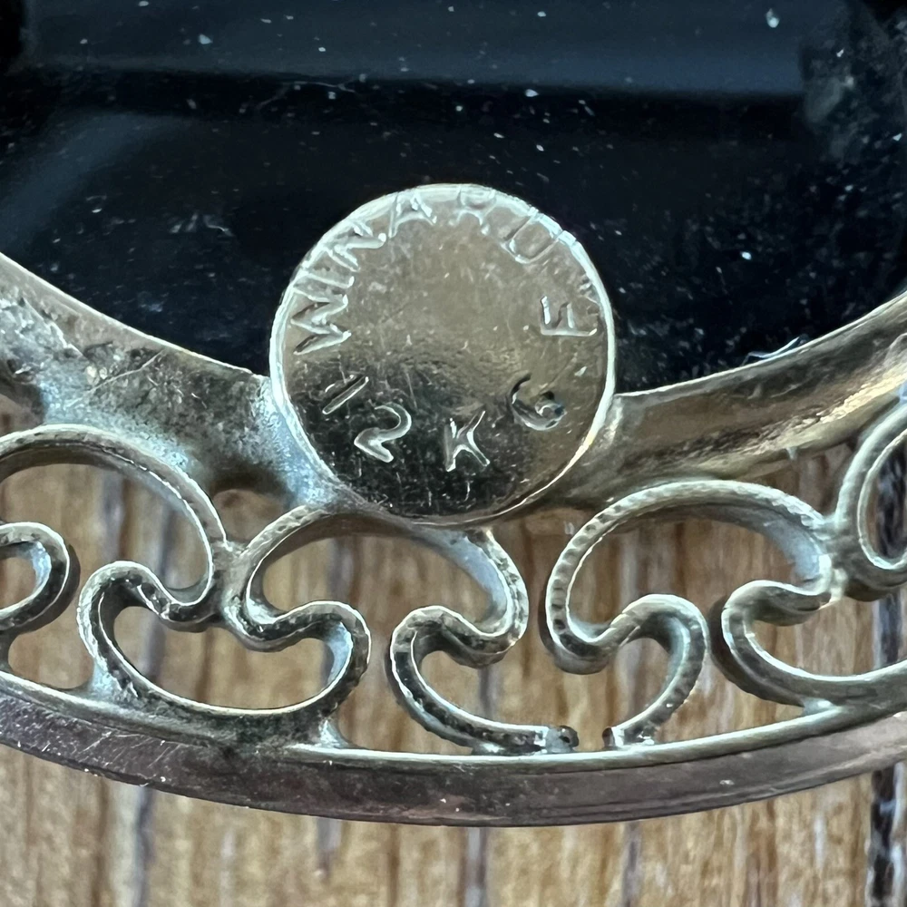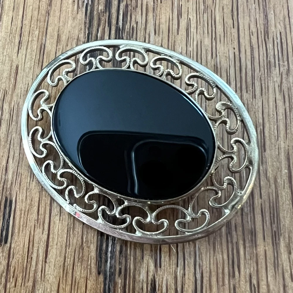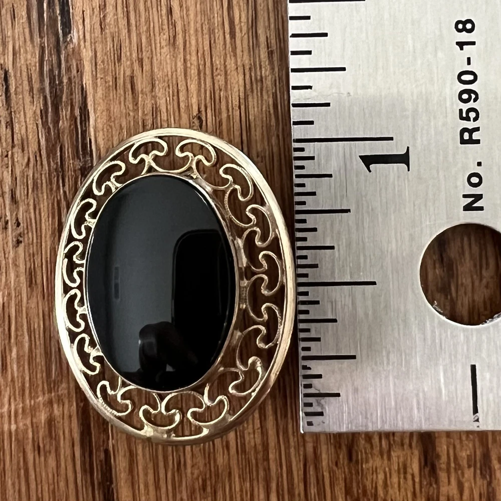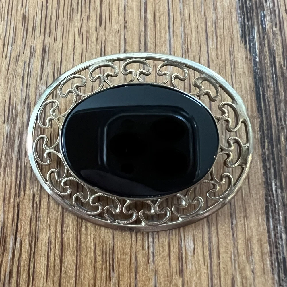 VINTAGE MARKED WINARD 12K GOLD FILLED OVAL ONYX FILIGREE PIN BROOCH. Gently cleaned, otherwise sold as found. Please see photos for size and condition. Priced to MOVE! Bid now!