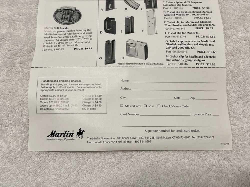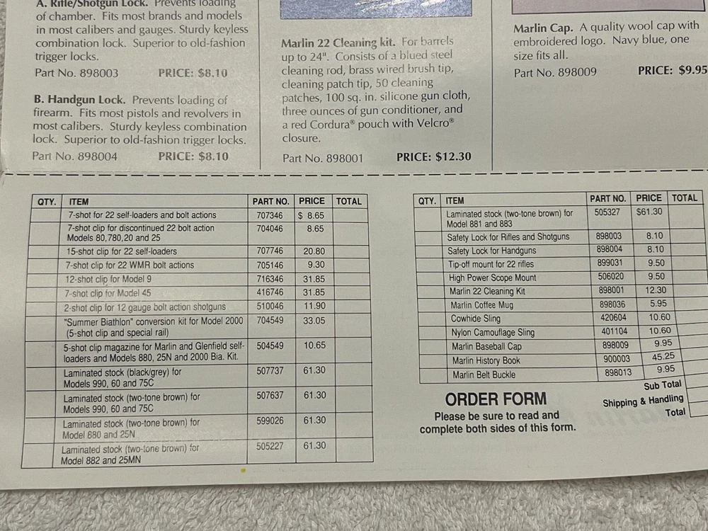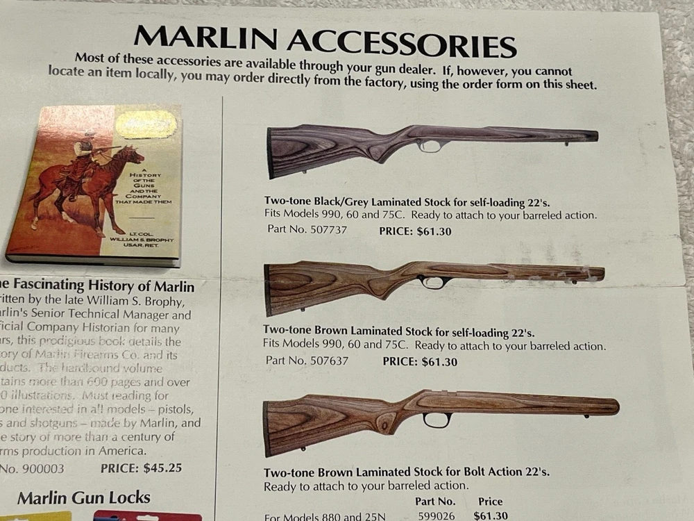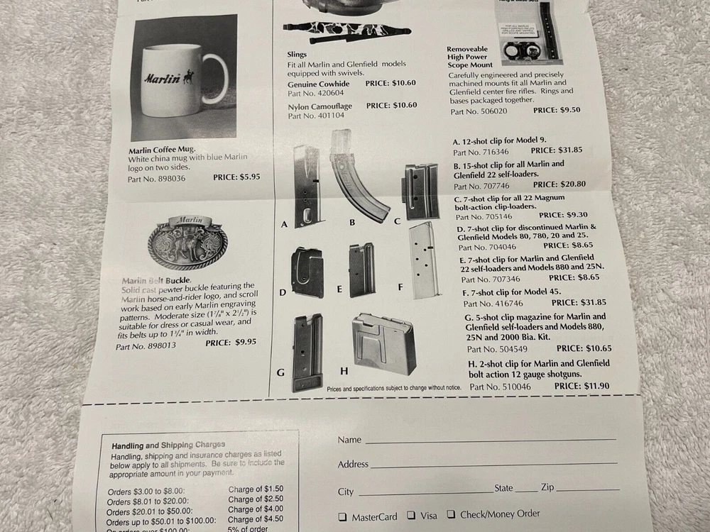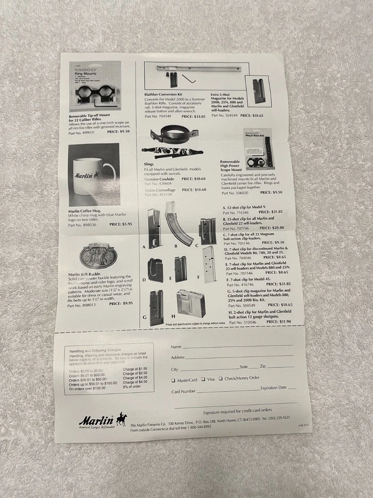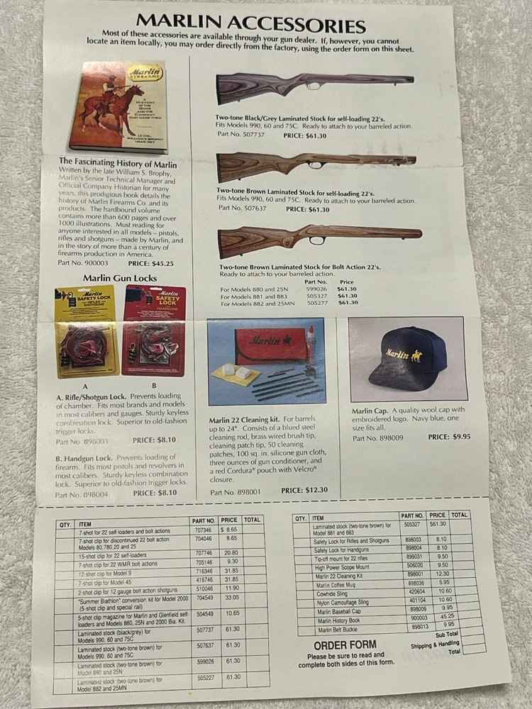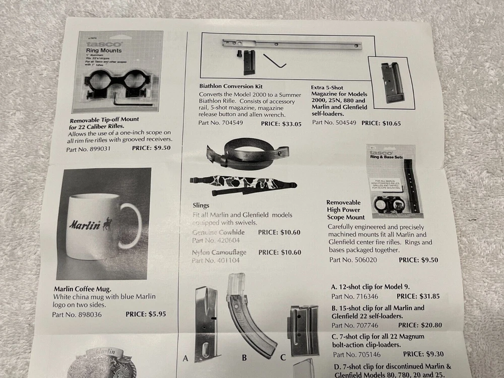 Vintage Marlin Accessories flyer that I would guess shipped with a firearm. It's in very nice condition. Guessing late 1980's into the 1990's but I can't find a date. Doesn't include the post 1996 .22 magazine so should be prior to that. Items are cheap!!From a gun shop that closed over 25 years ago. Please refer to images. Glad to combine freight when possible, please message me prior to paying for an invoice with combined freight amount. Message any questions or for more images. Thanks for looking!