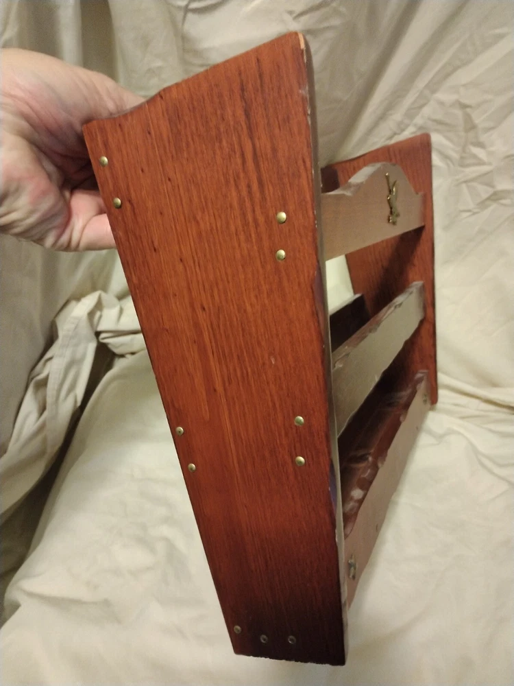 This is a vintage mid-century modern solid wood wall mount magazine rack with eagle emblem in the center it's 16.5x12x3 in at the bottom of the four and a half at the top very nice piece comes with mounting screws