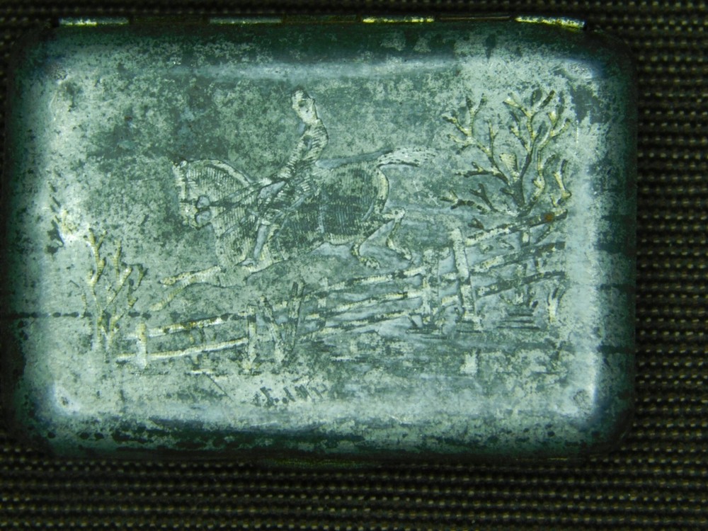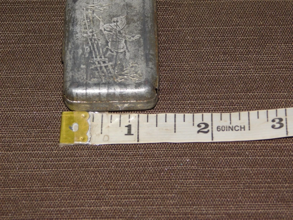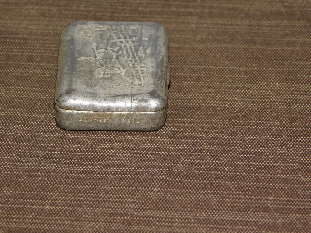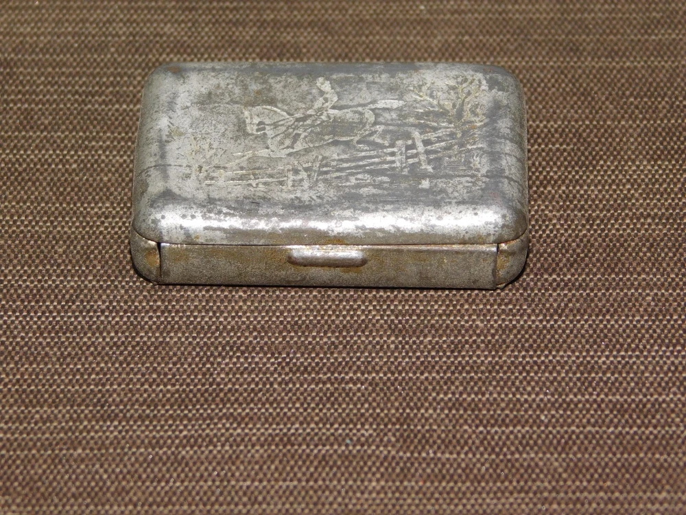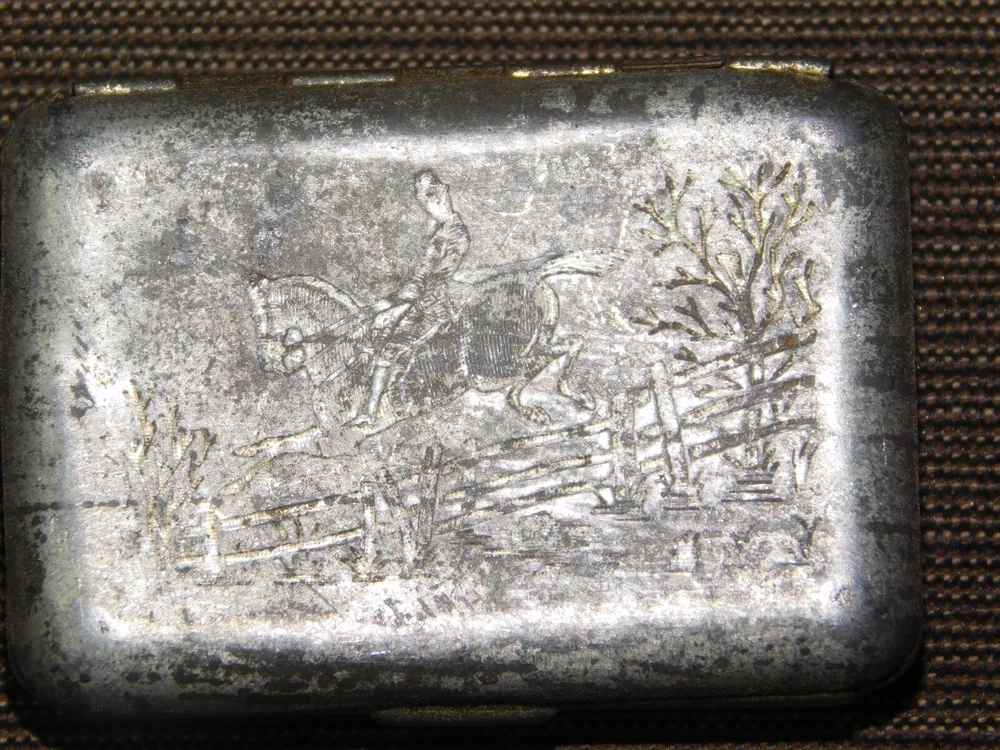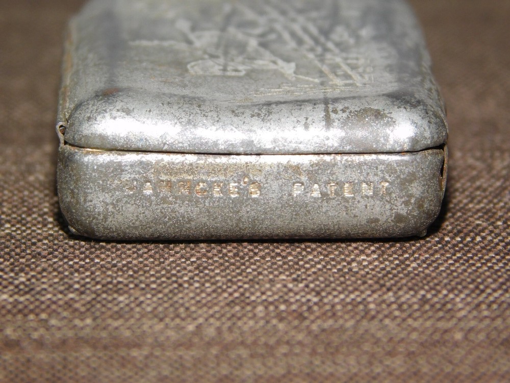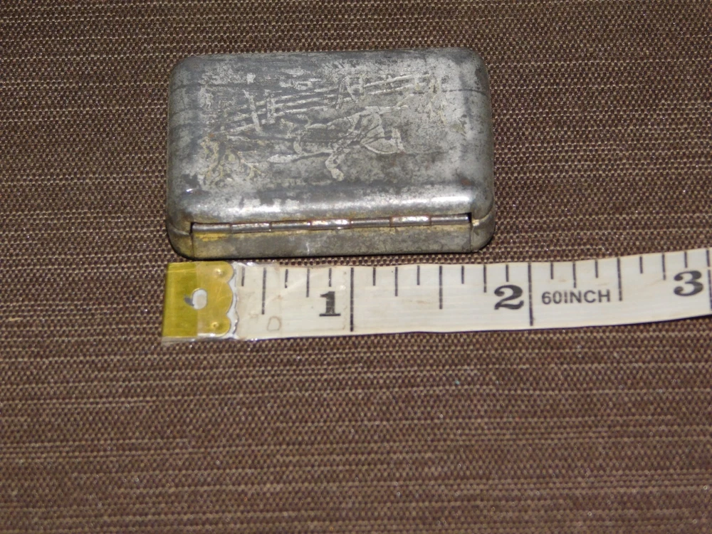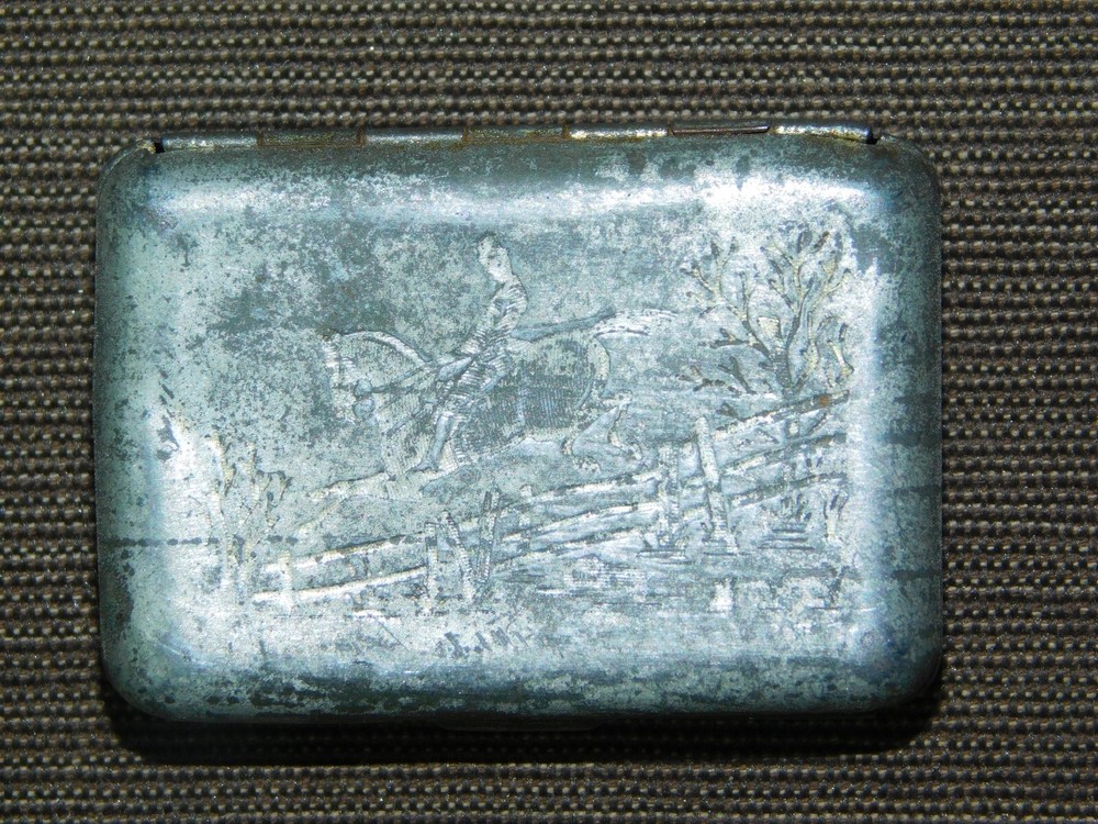 YOU ARE BIDDING ON... VINTAGE MEDICINE 1880 JAHNCK'S PATENT ENGRAVED MAN ON HORSE CAMPHOR TIN BOX ... ..SHOWS A LOT OF USAGE/AGE WEAR..HAS SCRATCHES/PAINT LOSS/DENTS/AGE DISCOLORATION...... PLEASE LOOK CLOSELY... PLEASE VIEW PHOTOS FOR CONDITION...***PLEASE E-MAIL IF YOU HAVE A QUESTION OR WANT AN ADDITIONAL PICTURE....PLEASE VISIT MY EBAY STORE FOR ADDITIONAL VINTAGE ITEMS..THANK YOU***3WBX0503-XXXX
