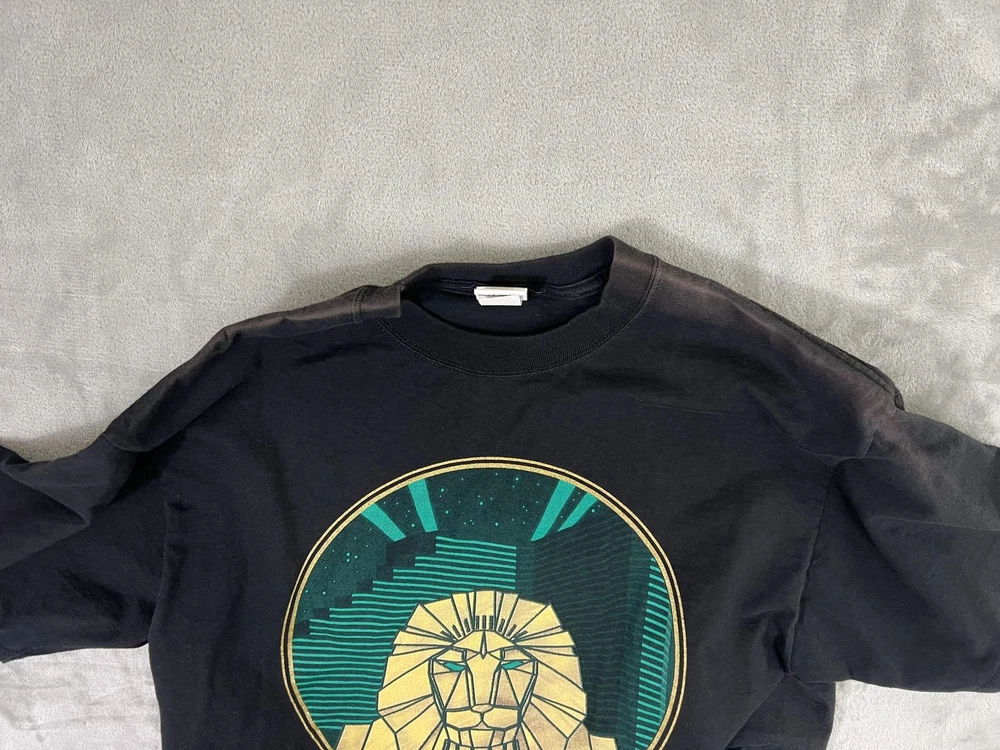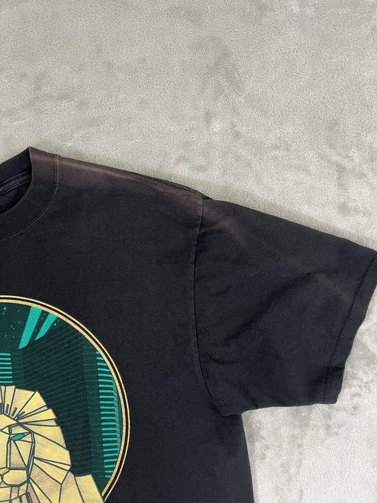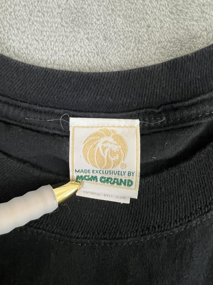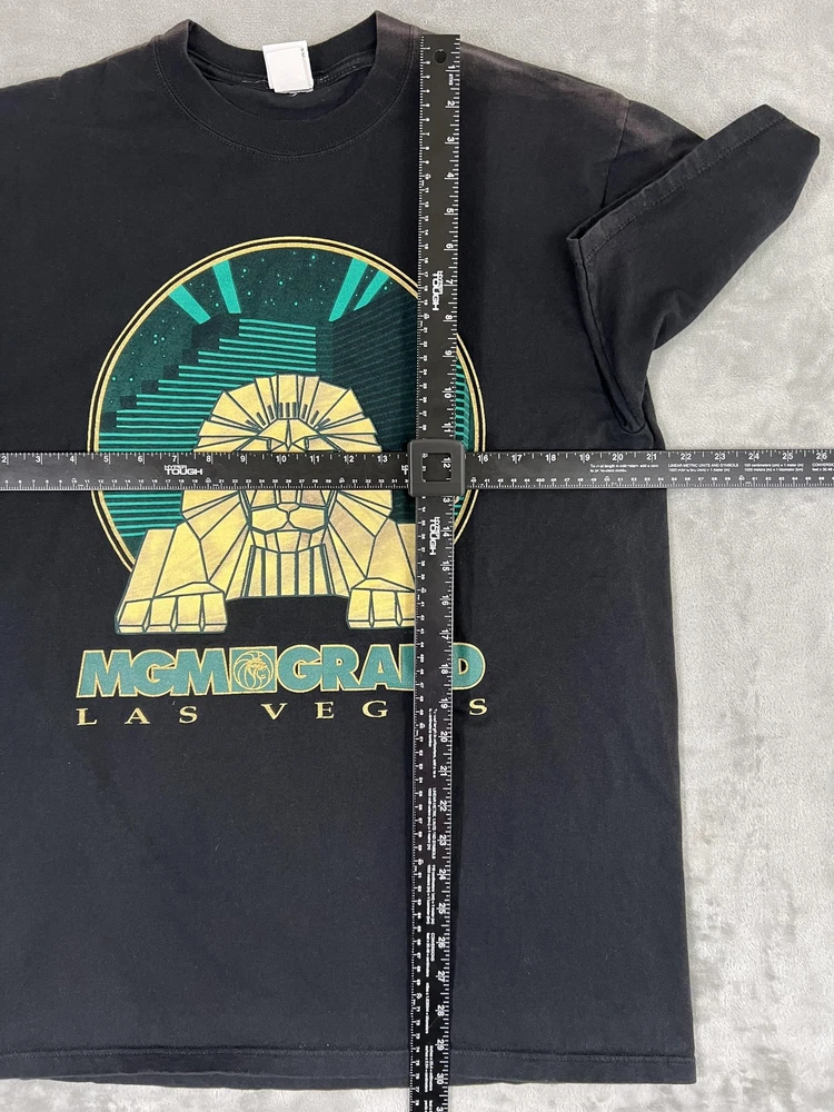 Brand/Subject: MGM Grand Las Vegas Tag info: TM & ©1993 MGM Grand Hotel, Inc. Material: 100% Cotton Made in U.S.A. Size: Large (Mens) Color: Black with teal and gold graphic Design: Large front graphic of the MGM Grand lion with stylized skyline; text reads "MGM GRAND LAS VEGAS." Style: Short sleeve crewneck shirt Era: 1993 (90s vintage) Labels: "Made exclusively by MGM Grand" neck label present Care tag (visible text): Machine wash cold water; wash separately; no bleach; tumble dry low Notes: Measurement tools shown in photos for reference only.