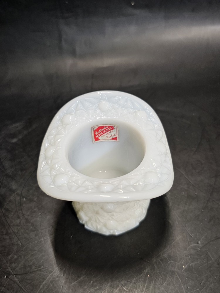 In excellent condition This Vintage Mid Century Fenton Milk Glass Top Hat Daisy Dot Toothpick Holder is a charming piece of decorative pottery and glassware originating from North America. The elegant design features a classic daisy and dots pattern on white milk glass, with a whimsical nod to the subject of a top hat. This vintage original piece from the Fenton brand captures the essence of the mid-century era with its unique style and production techniques. Perfect for collectors or those looking to add a touch of nostalgia to their home decor.