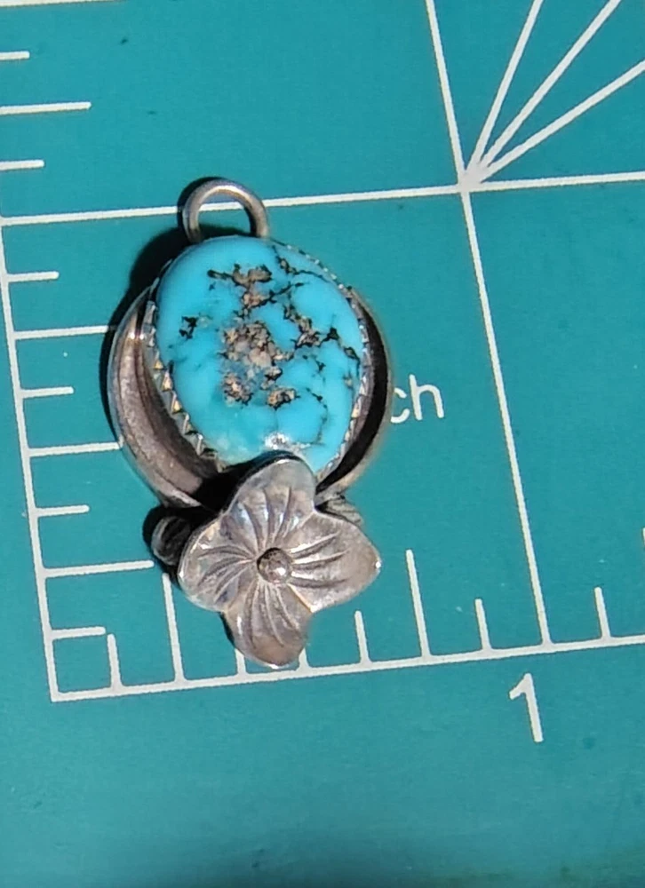 This vintage Navajo pendant features a unique asymmetrical amulet design crafted from sterling silver and set with a single oval turquoise gemstone. The pendant hangs from an 18-inch chain with a spring ring closure, in a style that exudes beauty and nature-inspired motifs. Handmade with a bezel setting, this unisex piece showcases Native American ethnic influences. Ideal for those who appreciate authentic tribal craftsmanship and timeless elegance in their jewelry collection. This piece is typical of the early Navajo Craftsman that doesn't waste money on stamps, therefore most Navajo jewelry is devoid of purity markings or trademarks. This is real authentic turquoise that appears to have traces of silver, and is hand etched .925 Sterling Silver, Tested positive for Sterling .925. Satisfaction Guaranteed or your money back! Umpqua Treasures Amy n Jeff