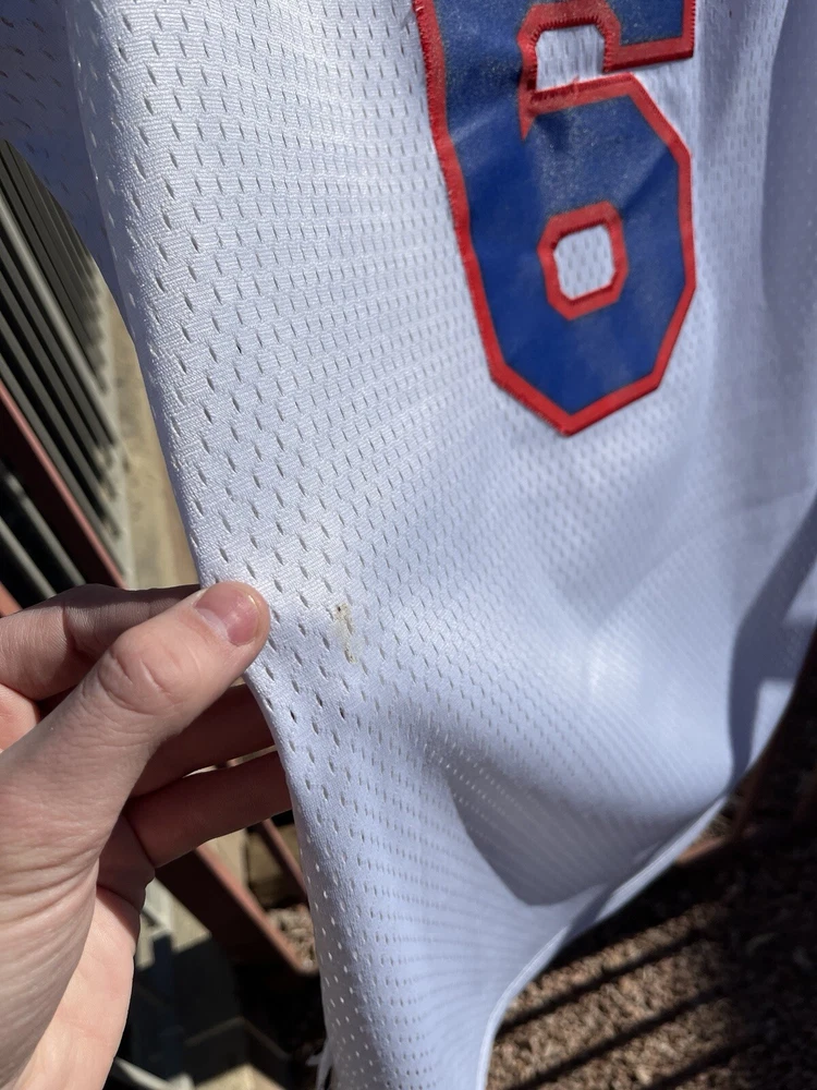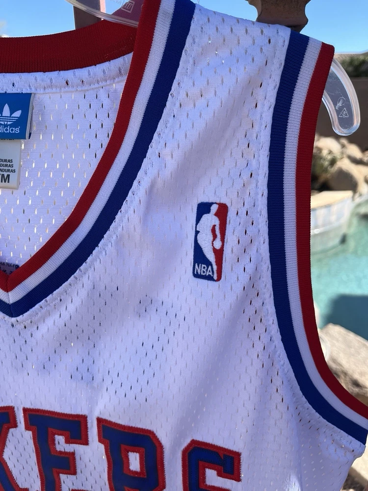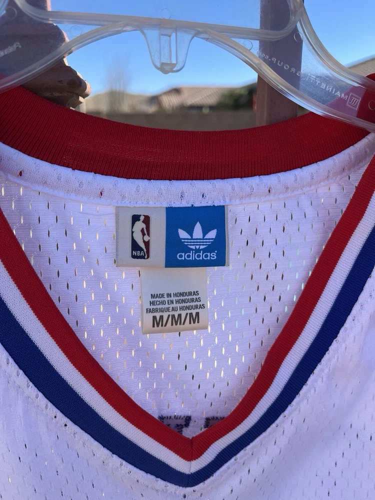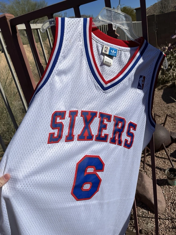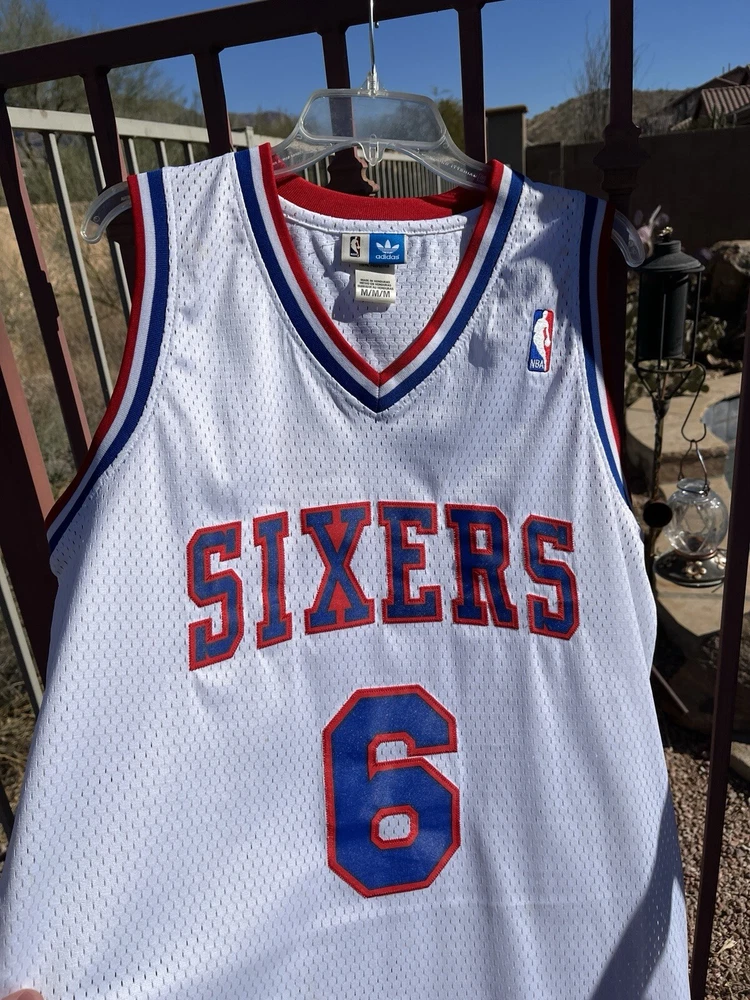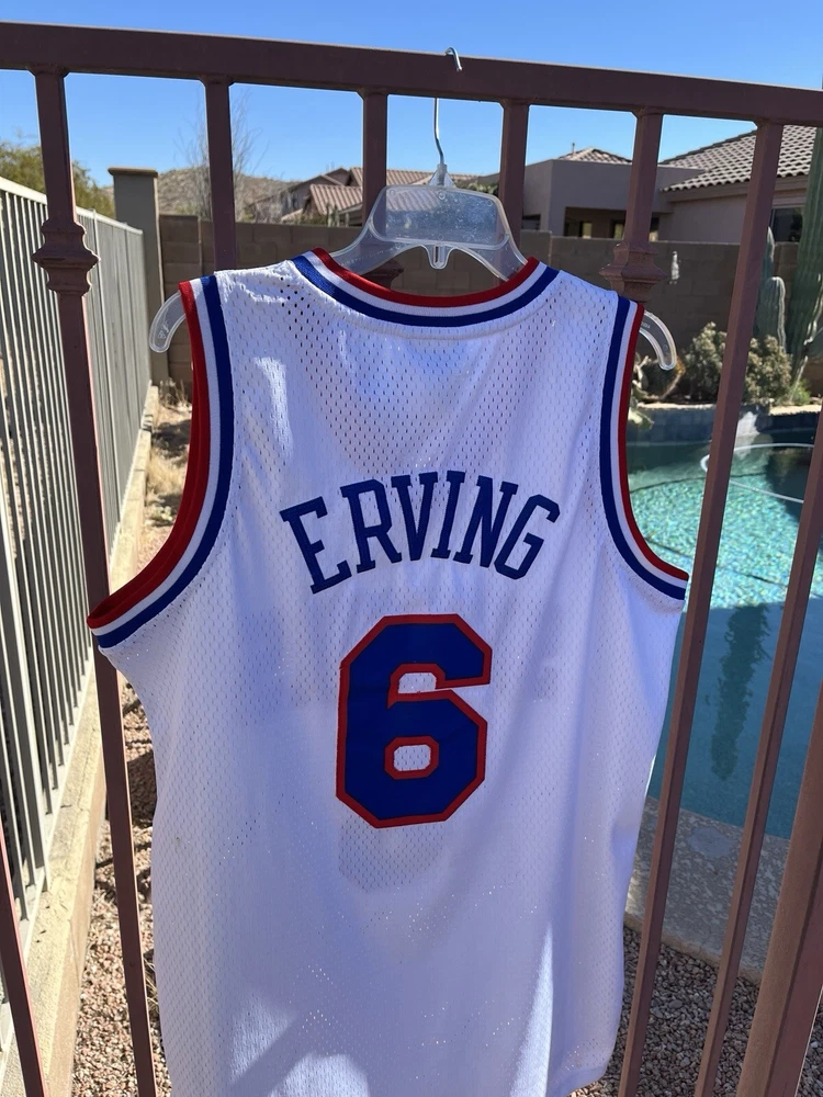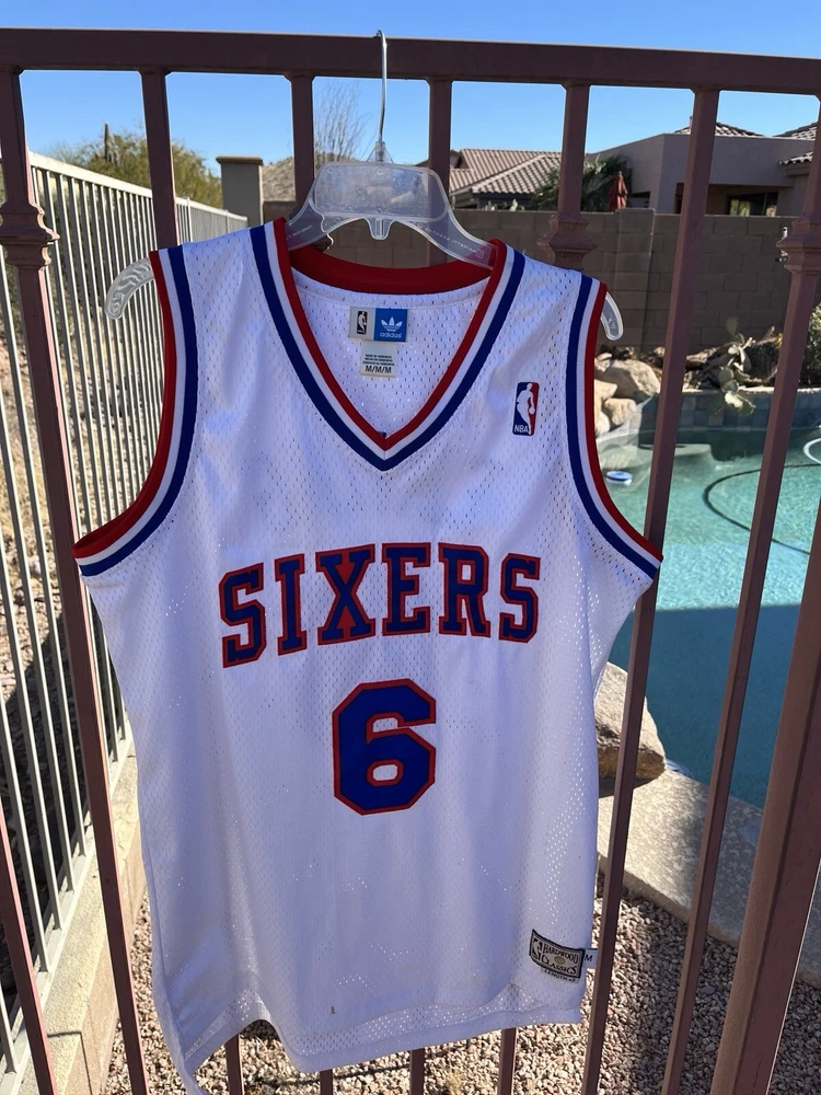 The product is a vintage adidas Hardwood Classics jersey of Julius Erving, an officially licensed item from the National Basketball Association (NBA). The jersey is in size medium, color white, and features the team Philadelphia 76ers. It is designed for men and is intended for regular season wear. This jersey is a piece of fan apparel and sports memorabilia, perfect for any basketball enthusiast looking to show support for both the team and the player.