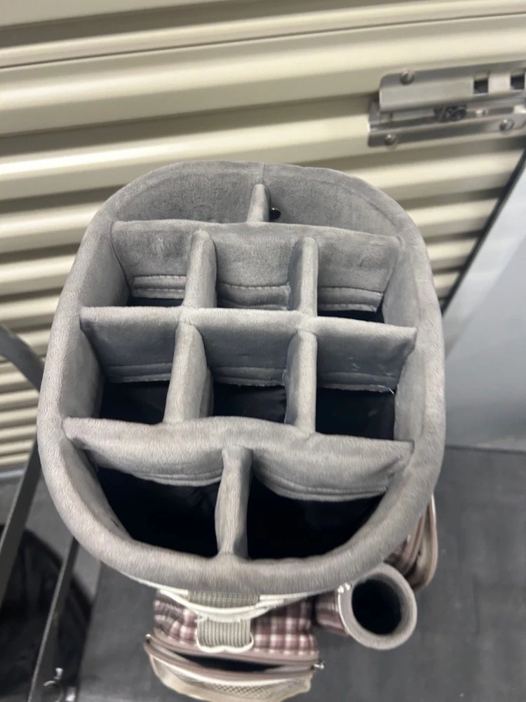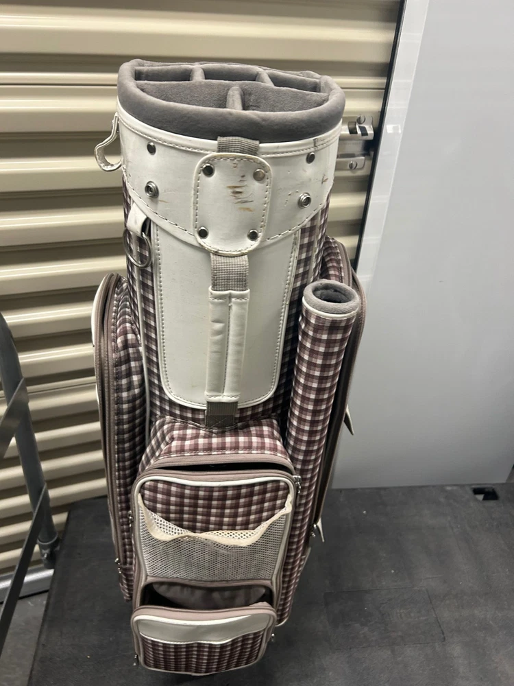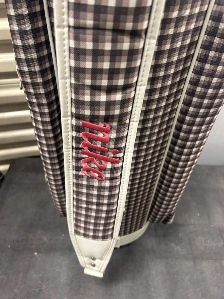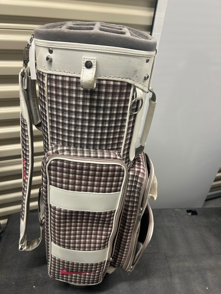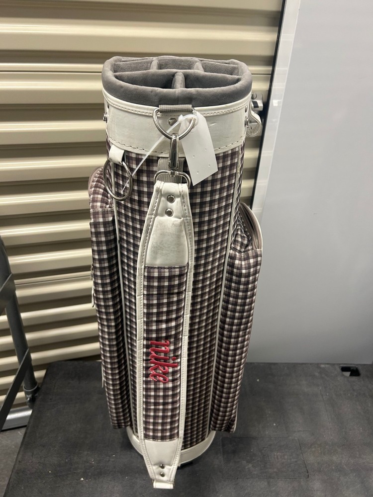 The Vintage Nike Designer Brassie Women's Cart Golf Bag is a stylish and functional accessory for female golfers. With a classic plaid design and the iconic Nike branding, this 10-way cart bag offers ample storage for golf clubs and equipment. Its sturdy construction and sleek silhouette make it a fashionable choice for any golf enthusiast looking for both quality and style on the course.