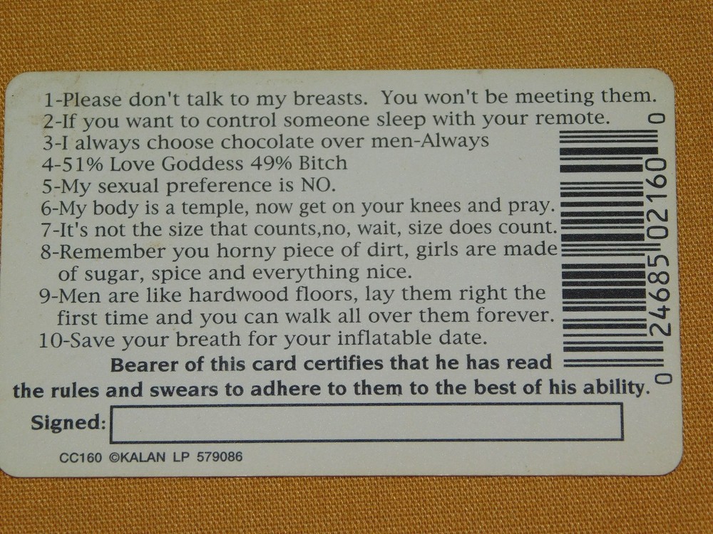YOU ARE BIDDING ON...... . . VINTAGE NOVELTY GAG GIFT COOL MEN PLEASE READ RULES BEFORE PROCEEDING CARD.. .. .. ..PLASTIC.... MEASURES APPROX 3 3/8" X 2 1/8"........ SHOWS SOME HANDLING/ AGE WEAR..........PLEASE VIEW PHOTOS FOR CONDITION.***PLEASE E-MAIL IF YOU HAVE A QUESTION OR WANT AN ADDITIONAL PICTURE....PLEASE VISIT MY EBAY STORE FOR ADDITIONAL VINTAGE ITEMS..THANK YOU*** 12P-8765-XXXX