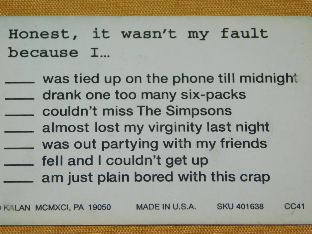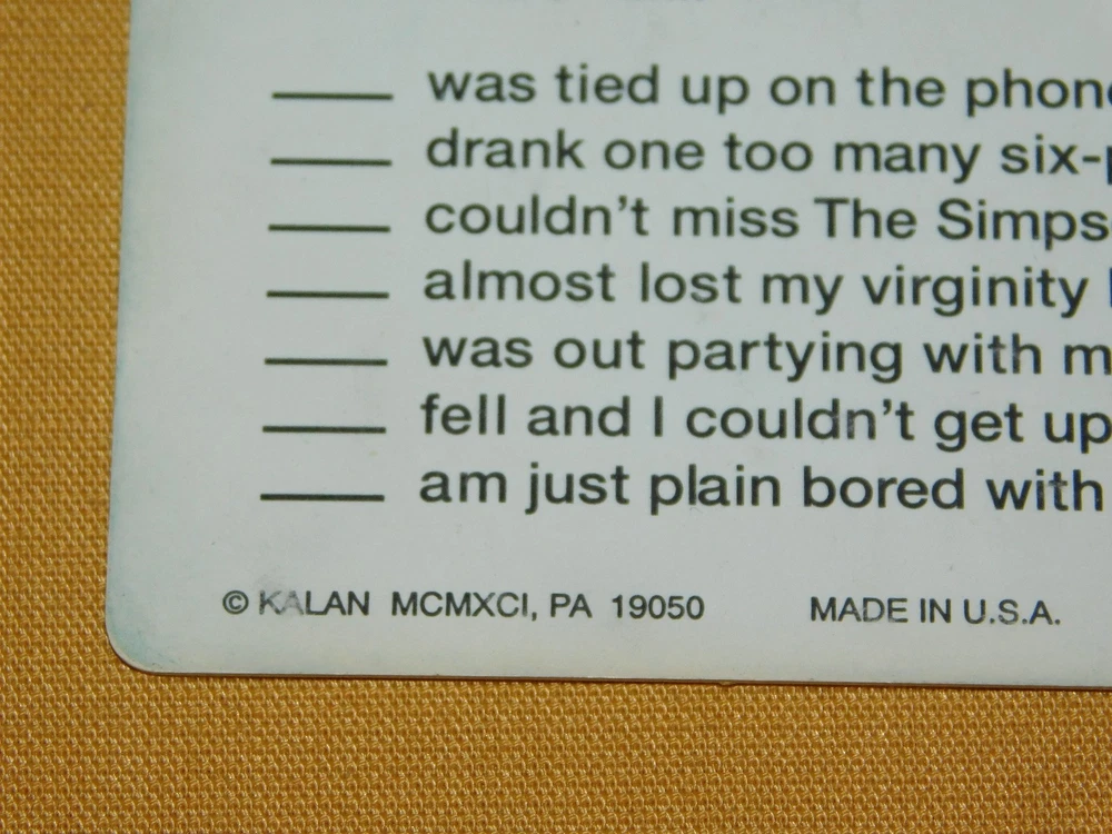 YOU ARE BIDDING ON...... . . VINTAGE NOVELTY GAG GIFT COOL STUFF OFFICIAL HOMEWORK EXCUSE CARD .. .. ..PLASTIC.... MEASURES APPROX 3 3/8" X 2 1/8"........ SHOWS SOME HANDLING/ AGE WEAR..........PLEASE VIEW PHOTOS FOR CONDITION.***PLEASE E-MAIL IF YOU HAVE A QUESTION OR WANT AN ADDITIONAL PICTURE....PLEASE VISIT MY EBAY STORE FOR ADDITIONAL VINTAGE ITEMS..THANK YOU*** 12P-8765-XXXX