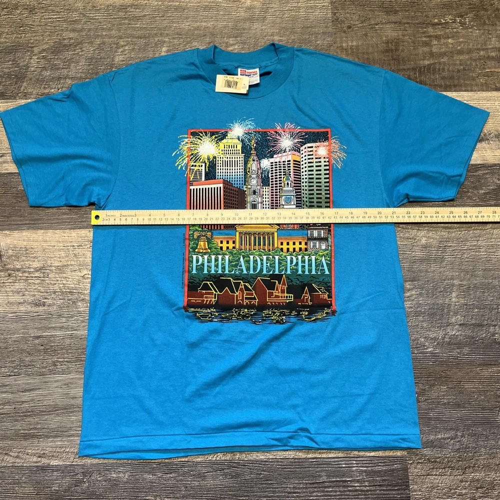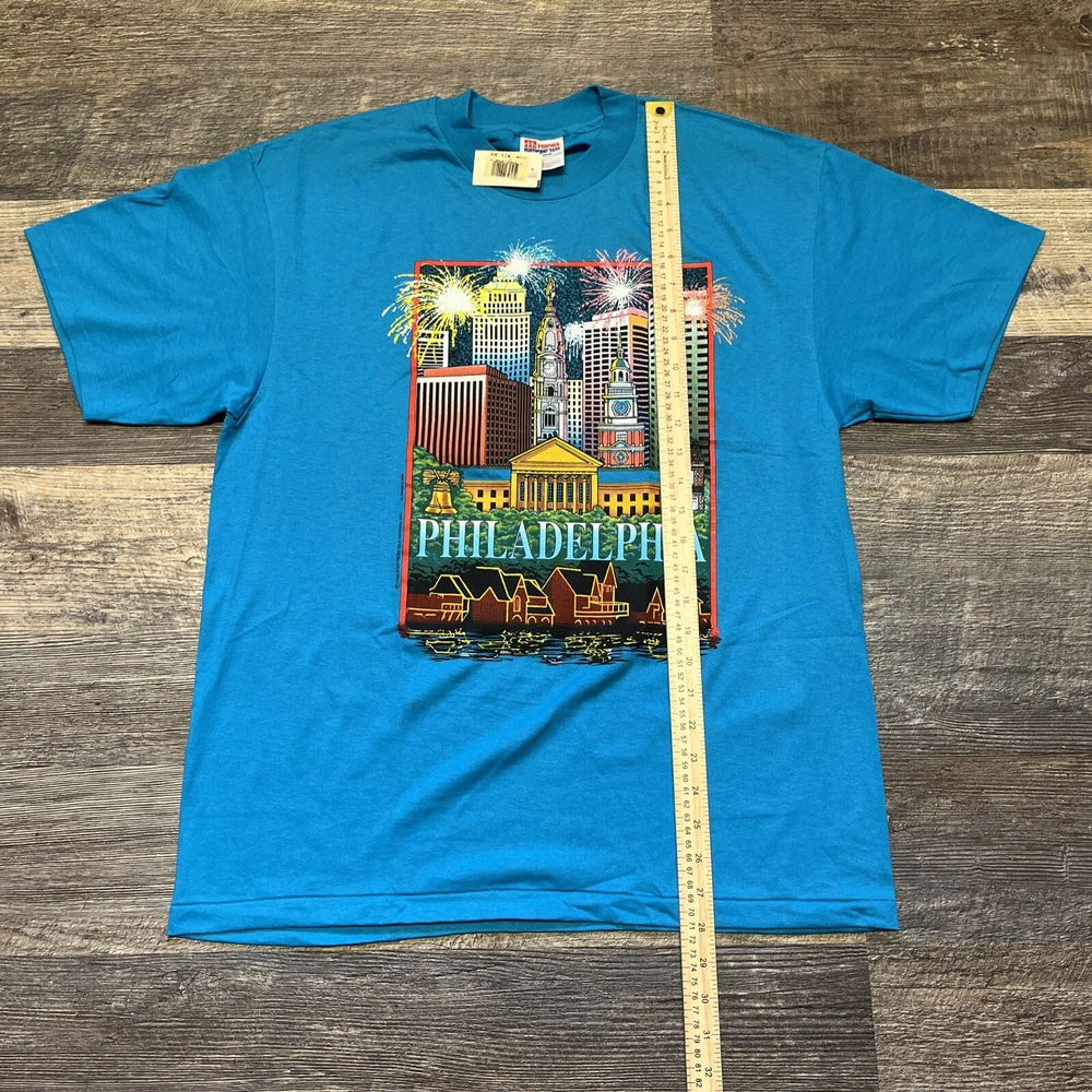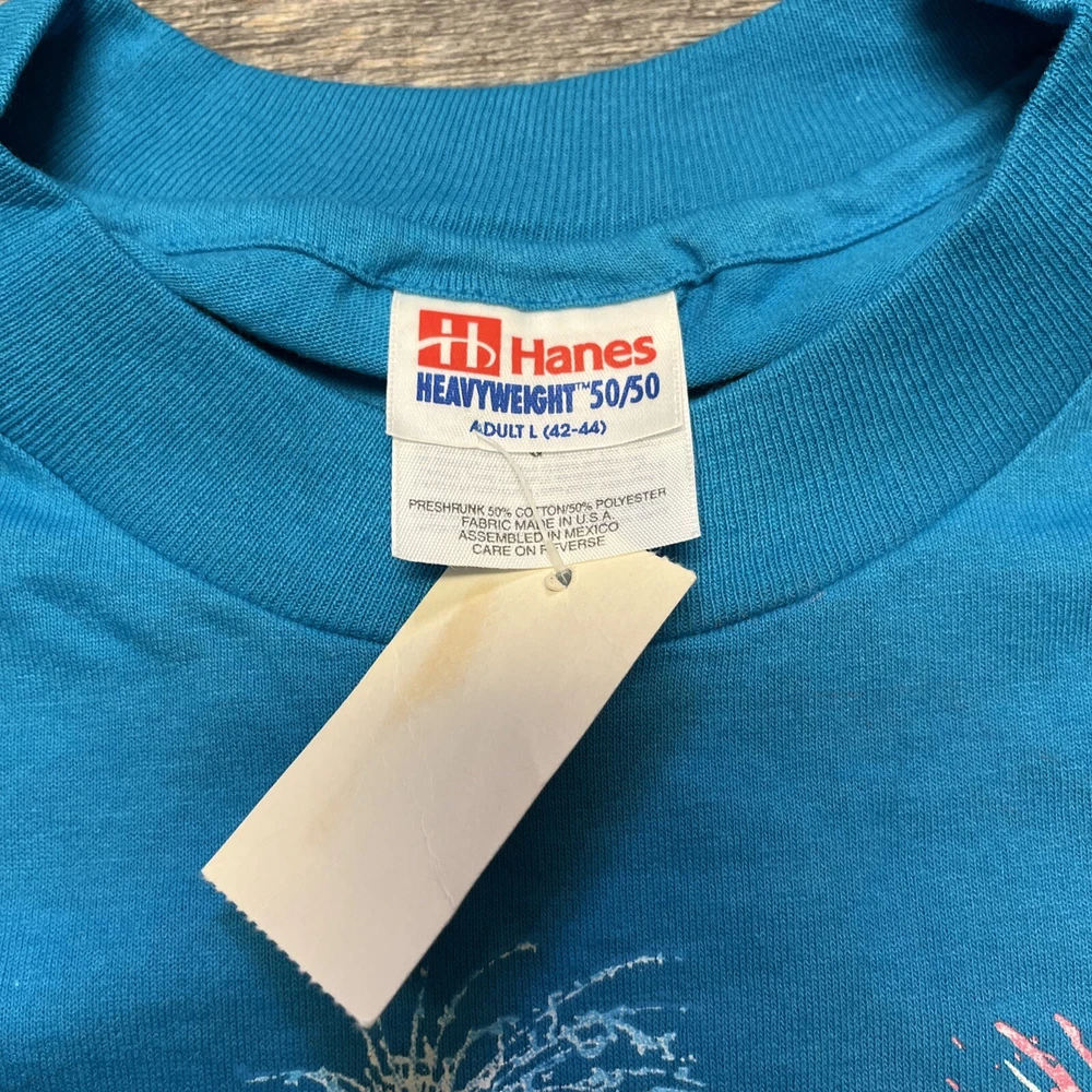 This vintage Hanes T-shirt features a classic fit with a crew neck and short sleeves, making it a great choice for summer, fall, or spring. The shirt is made of a knit fabric with a graphic print of the Liberty Bell, a symbol of American independence. The shirt is machine washable and made of 50% cotton and 50% polyester, ensuring both comfort and durability. This T-shirt is part of the Heavyweight 50/50 product line and is perfect for those who appreciate vintage clothing. It is available in size type Regular and is suitable for men. The shirt is not personalized and has no modifications, making it a great addition to any wardrobe.