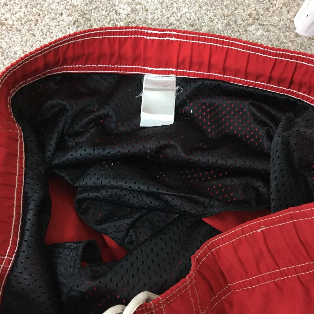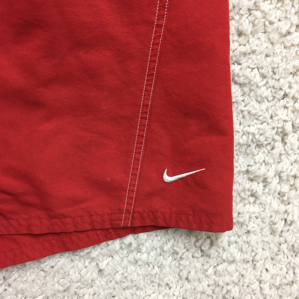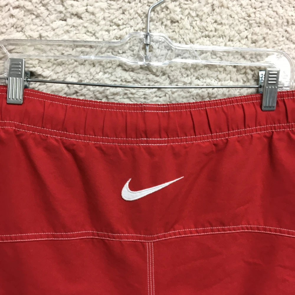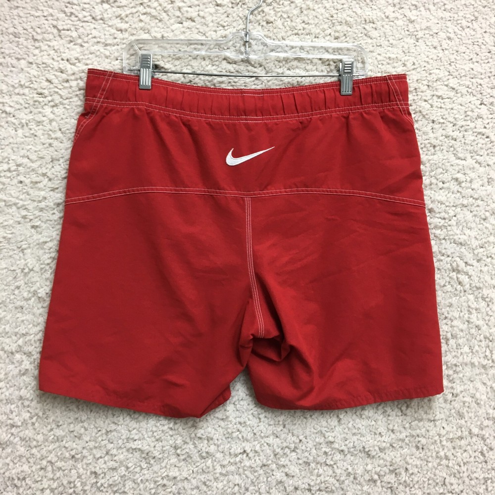 Department: Men Theme: Logo, Modern, Sports Fabric Type: Blended Fabric Pattern: Solid Vintage: Yes Features: Breathable, Drawstring, Elastic Waist, Lightweight, Pockets Country of Origin: Taiwan Swim Bottom Style: Trunks Color: Red Brand: Nike Size Type: Regular Size: XL Garment Care: Machine Washable Material: 100% Polyester, Polyester Seller Notes: “Good Used Condition. Please, See Pictures for Full Condition and Measurements.” Type: Bottom
