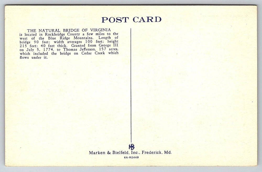 Seller Notes: “Good Vintage Condition. See Pictures And Description Closely For Details.” Finish: Matte Signed: No Character: Postcard City: Natural Bridge, Virginia Unit of Sale: Single Unit Continent: North America Featured Person: None Time Period Manufactured: NA Brand/Publisher: Marken & Biefield, Inc. Fredrick, Maryland Features: Divided Back, White Border, Original Genuine Antique Vintage Postcard Original/Licensed Reprint: Original Theme: Cities & Towns, Community Life, Domestic & Family Life, Famous Places, Historical Figures, Landscapes, Roadside America, Seasons, Social History, Tourism, Postcard, Antique, Vintage, Ephemera, Collectible, Memorabilia, Old, Retro, History, Card, Mail, Paper Postage Condition: Unposted Posted: No Franchise: Postcard Type: Linen Postcard Vintage: Yes Material: Paper Occasion: Postcard gtin13: DOES NOT APPLY Number of Items in Set: 1 Location: Natural Bridge, Virginia USA UPC: DOES NOT APPLY Signed By: None Region: Virginia Country: United States Country/Region of Manufacture: United States Orientation: Vertical Color: Multicolor Size: Standard (5.5 x 3.5 in) Era: Divided Back (1907-1915) Subject: Bridge Antique: Yes Stamp: No Artist: Postcard