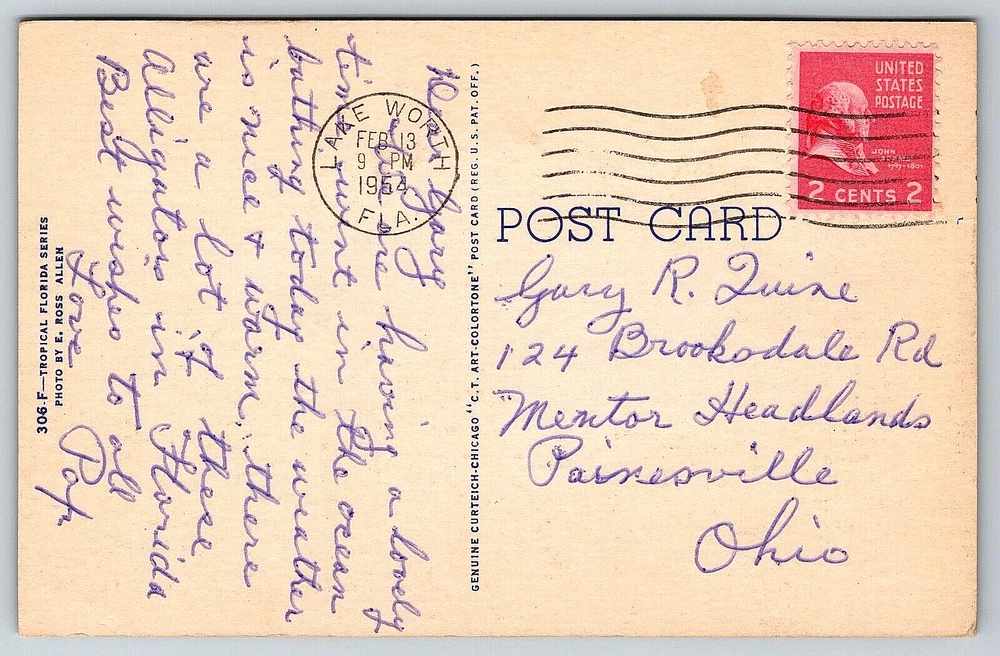 Postage Condition: Posted Antique: Yes Stamp: Yes Artist: Postcard Orientation: Horizontal Original/Licensed Reprint: Original Time Period Manufactured: 1950-1959 Posted: No Brand/Publisher: Curt Teich Featured Person: None Region: Florida Franchise: Postcard Signed: Yes Features: Divided Back, Stamp, Stamped, Original Genuine Antique Vintage Postcard City: Florida Occasion: Postcard Theme: Animals, Famous Places, Historical Figures, Landscapes, Seasons Signed By: Sender Era: Divided Back (1907-1915) Size: Standard (5.5 x 3.5 in) Country: United States Finish: Matte Type: VINTAGE OLD ANTIQUE POSTCARD ALLIGATOR FLORIDA USA Subject: Cities & Towns Country/Region of Manufacture: United States Seller Notes: “Good Vintage Condition. See Pictures And Description Closely For Details.” Unit of Sale: Single Unit Continent: North America Color: Multicolor Vintage: Yes Year Manufactured: 1952 Number of Items in Set: 1 UPC: DOES NOT APPLY Material: Paper gtin13: DOES NOT APPLY Character: Postcard Location: Florida, USA