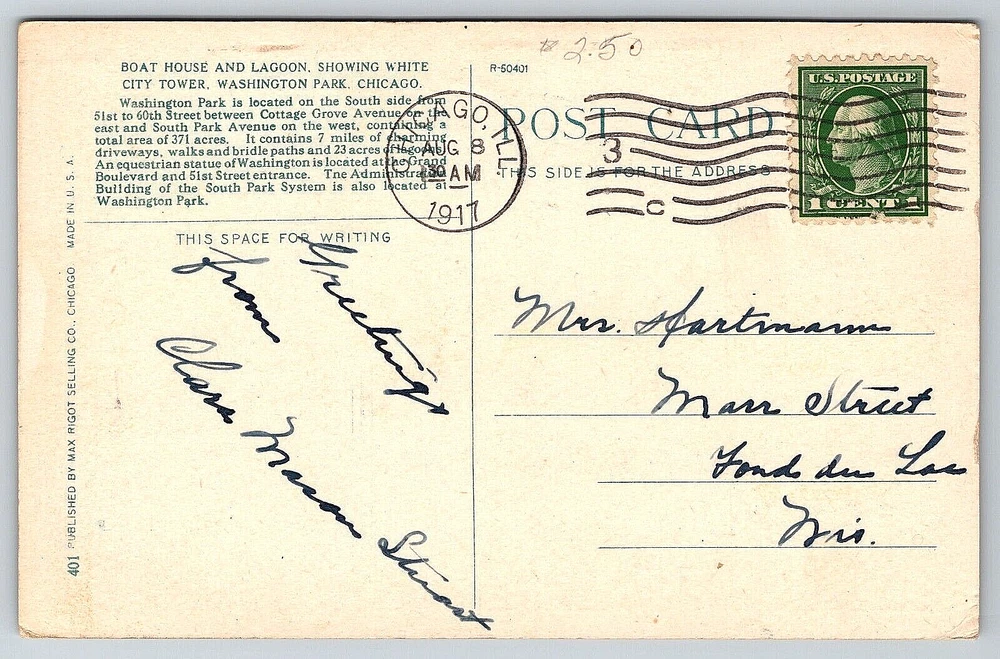 Size: Standard (5.5 x 3.5 in) Region: Illinois Vintage: Yes Finish: Matte Time Period Manufactured: NA Franchise: Postcard Country: United States Stamp: Yes Occasion: Postcard Character: Postcard Theme: Architecture, Cities & Towns, Community Life, Cultures & Ethnicities, Domestic & Family Life, Famous Places, Fashion, Historical Figures, Landscapes, Nautical, People, Roadside America, Seasons, Social History, Tourism, Transportation, Travel, Postcard, Antique, Vintage, Ephemera, Collectible, Memorabilia, Old, Retro, History, Card, Mail, Paper Artist: Postcard Color: Multicolor Brand/Publisher: MAX RIGOT SELLING COMPANY, CHICAGO, ILLINOIS Country/Region of Manufacture: United States Posted: Yes Antique: Yes Orientation: Horizontal Material: Paper Year Manufactured: 1917 Features: Divided Back, Stamp, Stamped, White Border, Original Genuine Antique Vintage Postcard Number of Items in Set: 1 Signed: Yes Continent: North America Signed By: Sender Era: Divided Back (1907-1915) Featured Person: People Type: VINTAGE OLD ANTIQUE POSTCARD Seller Notes: “Good Vintage Condition. See Pictures And Description Closely For Details.” Unit of Sale: Single Unit Location: Chicago, Illinois USA Postage Condition: Posted Original/Licensed Reprint: Original gtin13: DOES NOT APPLY UPC: DOES NOT APPLY City: Chicago Subject: Cities & Towns