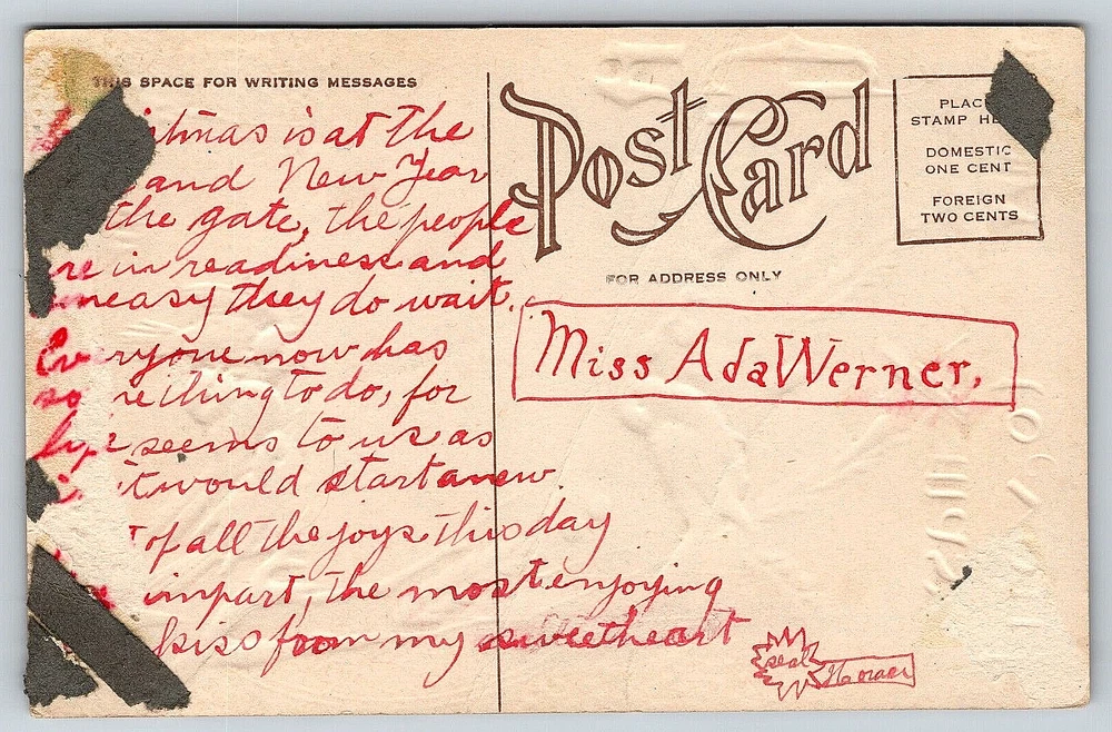 WELCOME TO People And Places Of The Past Vintage Photographs & Postcards Here you will find genuine, antique, vintage postcards that can be used for collecting, genealogy, or crafting. Please visit our ebay store for postcards and collectibles. Thank You for shopping with us! This vintage, antique postcard is in good condition. Please see high resolution pictures of the front and back of this postcard closely for detailed cosmetic condition prior to purchase. This postcard measures 3.50 inches by 5.50 inches. This postcard will be shipped to you packaged well inside of a clear plastic sleeve, inside of a quality 450 GSM rigid, sturdy stay flat envelope with cardboard inside to keep the card flat, and to protect the card during shipping within the United States. DO NOT BEND stickers will be applied to the outside of the envelope. Your post card will be delivered to the post office the same day, or the next business day, after receiving payment. Bad weather and holidays can affect the delivery times. Returns are accepted within 30 days of purchase. SHIPPING OPTIONS: Choose The Best Option For You For Cost And Speed Of Delivery 1. EBAY STANDARD ENVELOPE This is USPS First Class Mail and our standard way of shipping. No tracking (or minimal tracking) with this option. 3 - 6 business days (or longer) estimated delivery, depending on destination location. If you would like your postcard faster, please choose one of the other options below. 2. USPS GROUND ADVANTAGE Full bar code tracking available with this option. 2 - 5 business days estimated delivery, depending on destination location. 3. USPS PRIORITY MAIL Full bar code tracking available with this option. 1 - 4 business days estimated delivery, depending on destination location. Each item is inspected, packaged, weighed, and sealed individually for FAST SHIPPING! We try our best to represent the item in the images as accurately as we can. However, due to variations in color in image scanners, computer screens, and cell phone displays, the color may be slightly different than the actual product. Vintage post cards and photographs can show normal signs of wear associated with an antique image including paper curling, folds, multiple creases, holes, dents, stains, rips, water damage, odors, scratches, worn edges, fading, crackling, handwriting, finger prints, postage cancellations, postage stamps, missing pieces, trimming, glue or paper residue from being put into or taken out of old postcard/photograph albums, odors, other damage that may not show up by the image scanner, or can be out of focus by the original printer or photographer. They will have imperfections from being mailed and/or from their antique age. Thank You For Shopping With People And Places Of The Past! Visit our ebay store at www.ebay.com/str/peopleandplacesofthepast New Items Added Every Week!