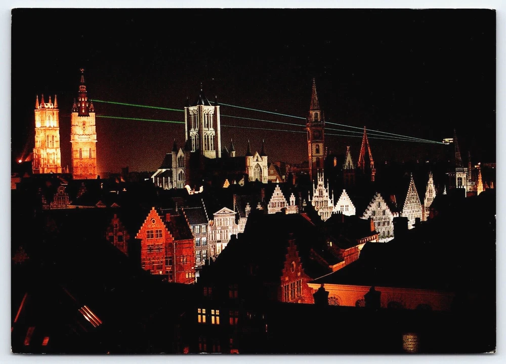 VINTAGE OLD ANTIQUE POSTCARD CITY BUILDINGS LASER BEAM AT NIGHT BRUSSELS BELGIUM