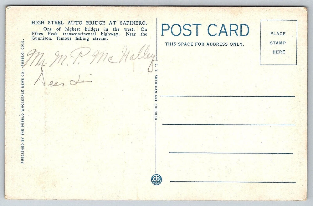 VINTAGE OLD ANTIQUE POSTCARD HIGH STEEL AUTO BRIDGE HIGHWAY SAPINERO COLORADO