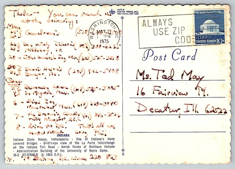 Posted: Yes Orientation: Horizontal Seller Notes: “Good Vintage Condition. See Pictures And Description Closely For Details.” Year Manufactured: 1975 Antique: Yes Postage Condition: Posted Subject: Cities & Towns Signed By: Sender Vintage: Yes Type: VINTAGE OLD ANTIQUE POSTCARD Era: Divided Back (1907-1915) Occasion: Postcard Finish: Glossy Featured Person: None Theme: Aerial View, Architecture, Cities & Towns, Community Life, Countries, Cultures & Ethnicities, Domestic & Family Life, Famous Places, Greetings, Historical Figures, Landscapes, Photographs, Roadside America, Seasons, Social History, Tourism, Transportation, Travel, Postcard, Antique, Vintage, Ephemera, Collectible, Memorabilia, Old, Retro, History, Card, Mail, Paper Continent: North America Character: Postcard Original/Licensed Reprint: Original Stamp: Yes Country/Region of Manufacture: United States Size: Continental (6 x 4 in) City: Indiana Unit of Sale: Single Unit Brand/Publisher: Dexter Press Region: Indiana Time Period Manufactured: 1970-1979 Color: Multicolor Location: Indiana USA Country: United States Franchise: Postcard Signed: Yes Number of Items in Set: 1 gtin13: DOES NOT APPLY Features: Divided Back, Stamp, Stamped, Original Genuine Antique Vintage Postcard Artist: Postcard Material: Paper UPC: DOES NOT APPLY