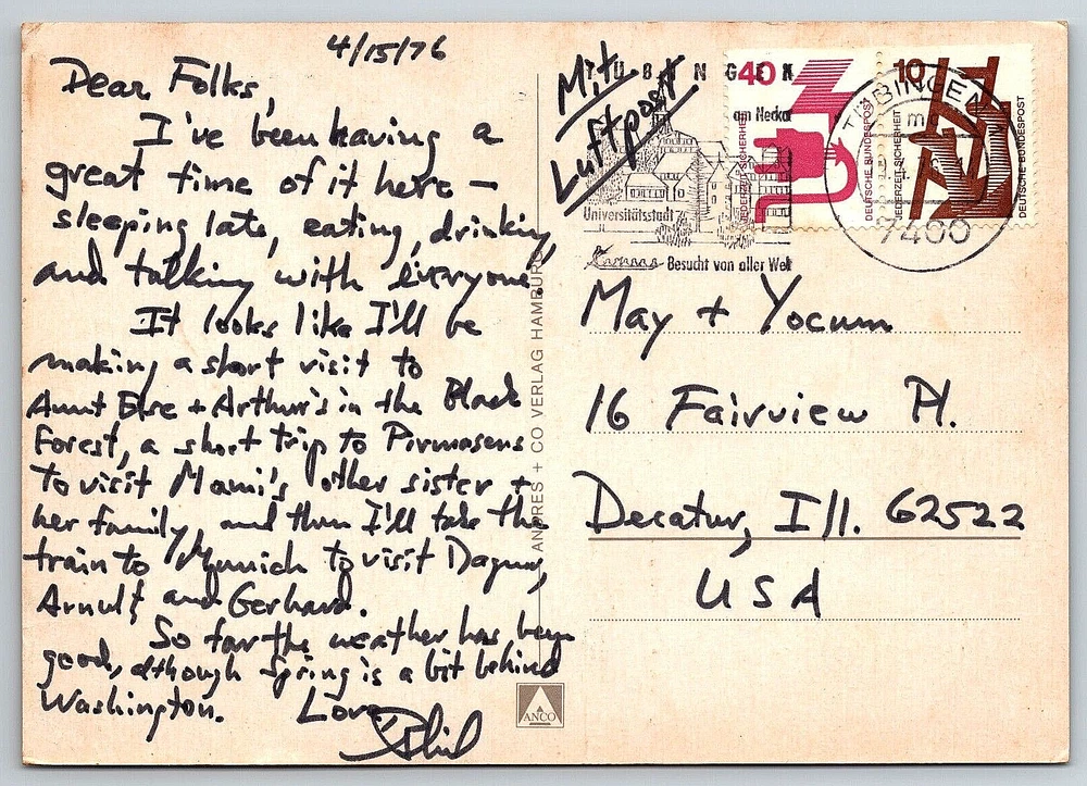 Year Manufactured: 1976 Postage Condition: Posted Finish: Glossy Franchise: Postcard Original/Licensed Reprint: Original Unit of Sale: Single Unit Signed: Yes Time Period Manufactured: 1970-1979 Brand/Publisher: ANDRES & CO. gtin13: DOES NOT APPLY Theme: Architecture, Cities & Towns, Community Life, Countries, Cultures & Ethnicities, Domestic & Family Life, Famous Places, Fashion, Greetings, Landscapes, People, Photographs, Seasons, Social History, Tourism, Transportation, Travel Continent: Europe Seller Notes: “Good Vintage Condition. See Pictures And Description Closely For Details.” Material: Paper UPC: DOES NOT APPLY Character: Postcard Signed By: Sender Type: VINTAGE OLD ANTIQUE POSTCARD Featured Person: People Features: Divided Back, Stamp, Stamped, Original Genuine Antique Vintage Postcard Artist: Postcard Country: Germany Subject: Cities & Towns Vintage: Yes Orientation: Vertical Number of Items in Set: 1 Occasion: Postcard Posted: Yes Location: Reutlingen, Germany Era: Divided Back (1907-1915) Country/Region of Manufacture: Germany Antique: Yes City: Reutlingen Stamp: Yes Region: Reutlingen Size: Continental (6 x 4 in) Color: Multicolor