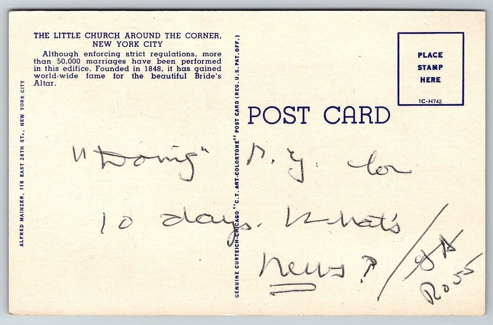 VINTAGE OLD ANTIQUE POSTCARD THE LITTLE CHURCH AROUND THE CORNER NEW YORK CITY