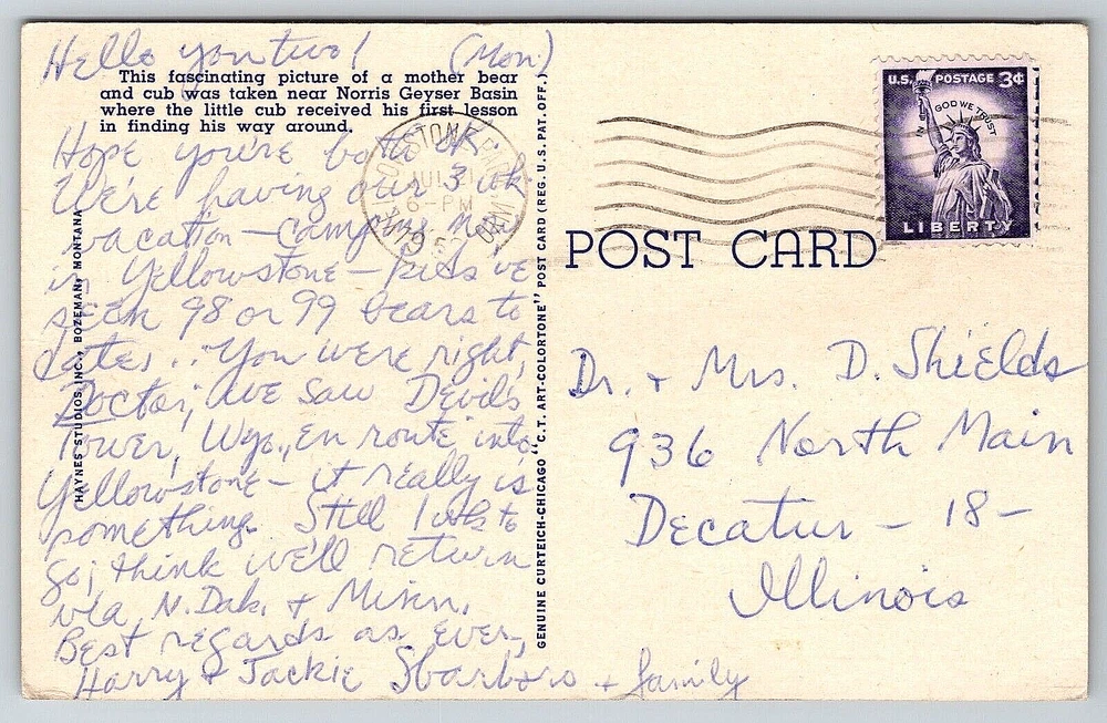 VINTAGE OLD ANTIQUE POSTCARD YELLOWSTONE NATIONAL PARK MOTHER BEAR CUB HIKING