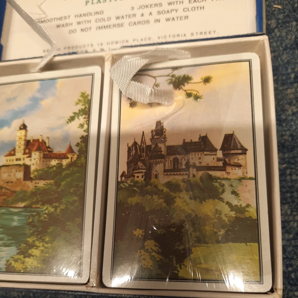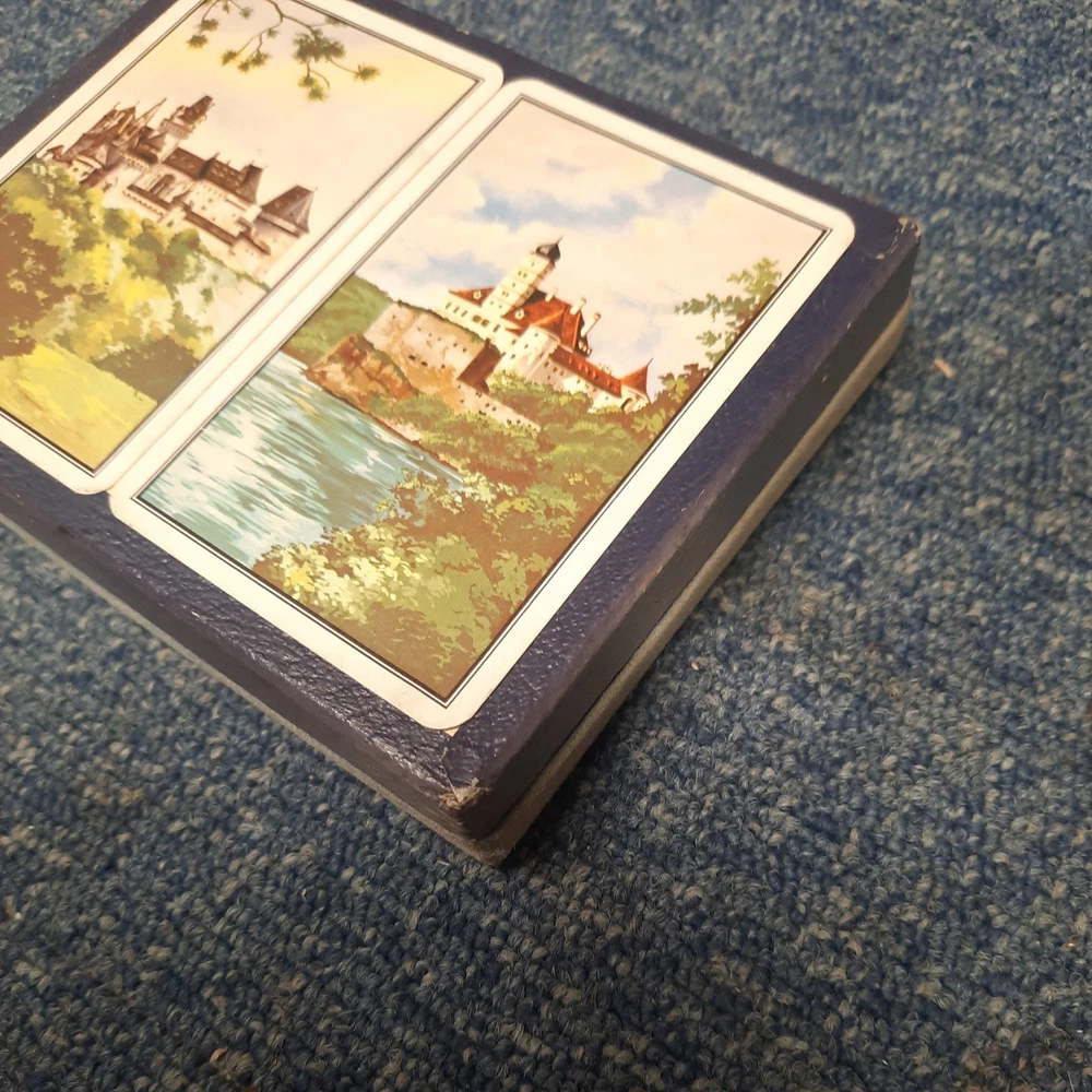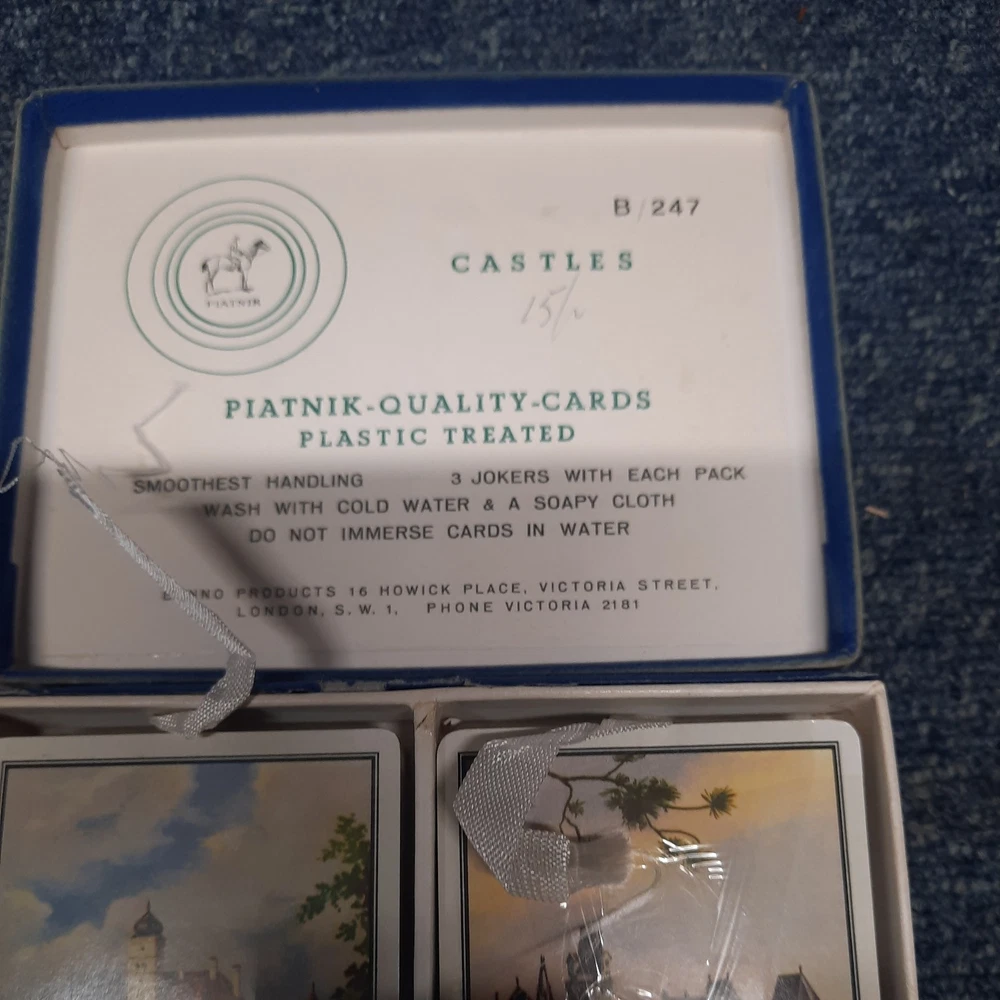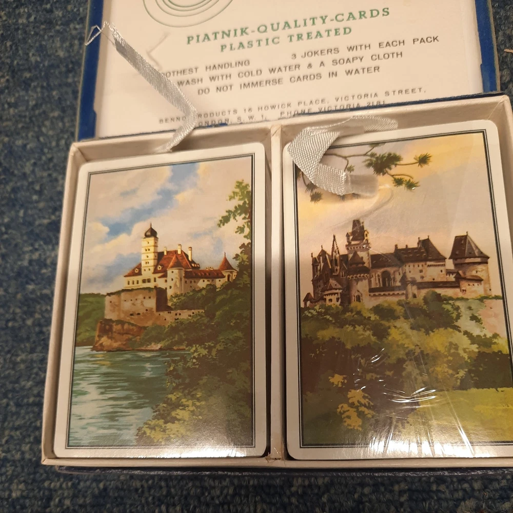 This is a pair of vintage Piatnik Benno products London. playing cards from Austria, featuring a theme of buildings and architecture, specifically castles. The decks are modern (1970-now) and are not modified. They are ideal for collectors of playing cards and paper ephemera. with gold leaf corners these are new cards still wrapped in film. Showing lovely patina on the box.