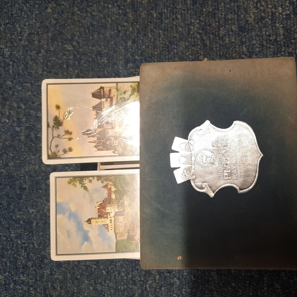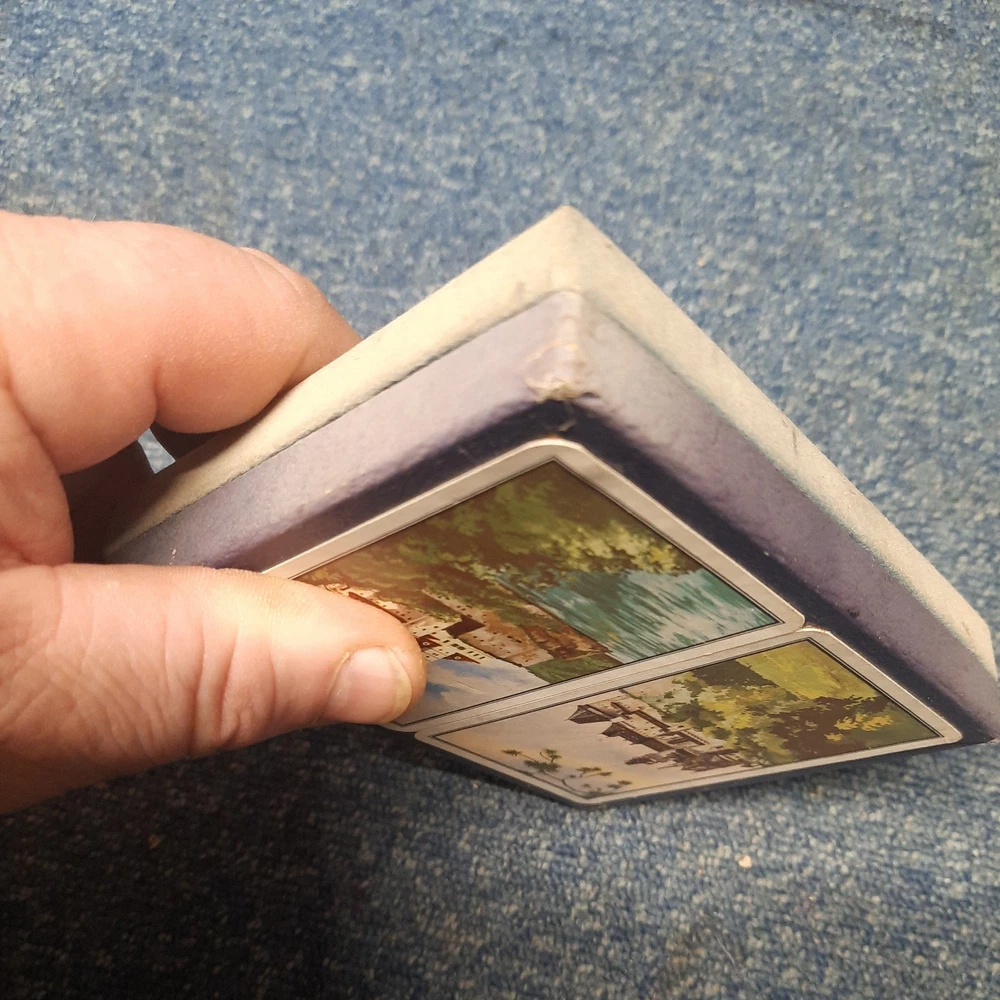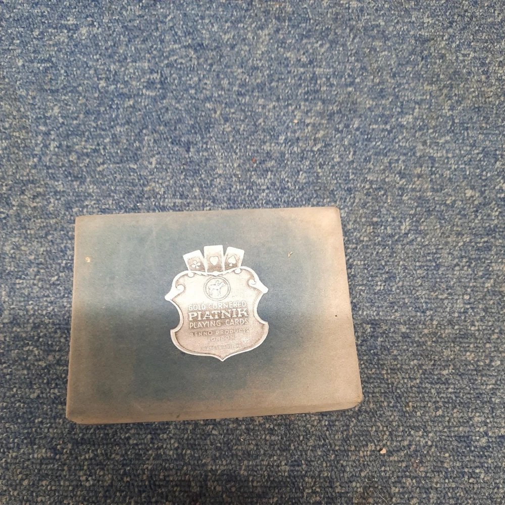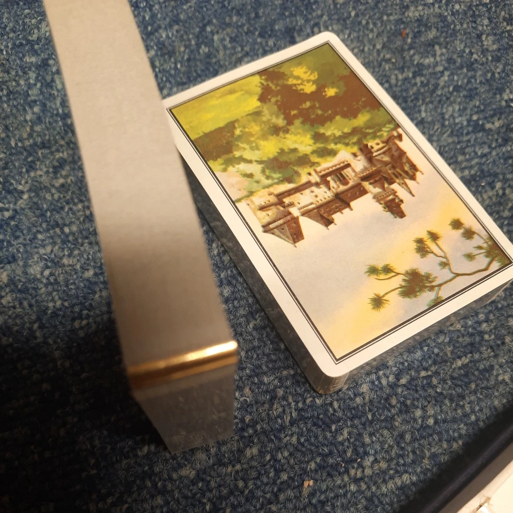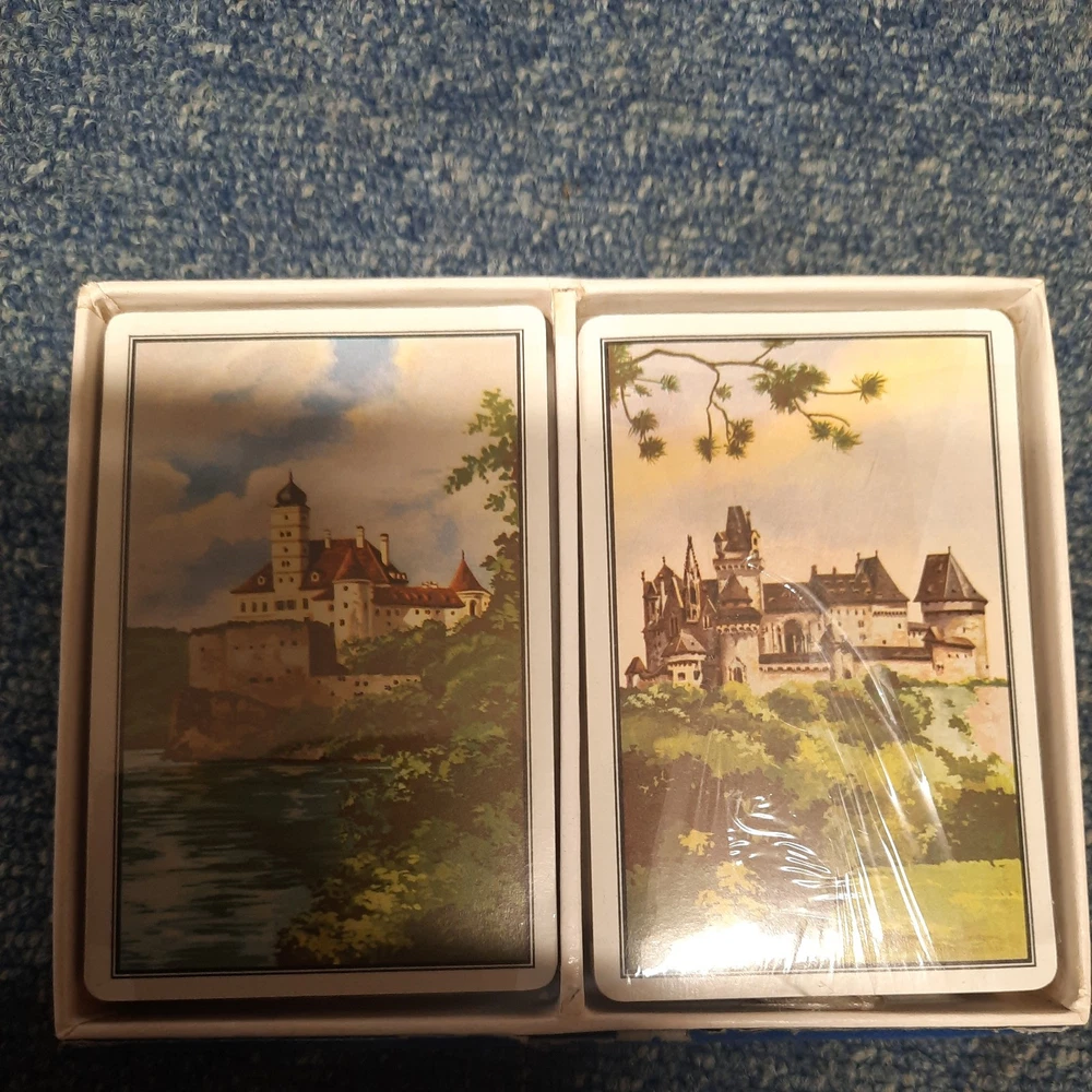 This is a pair of vintage Piatnik Benno products London. playing cards from Austria, featuring a theme of buildings and architecture, specifically castles. The decks are modern (1970-now) and are not modified. They are ideal for collectors of playing cards and paper ephemera. with gold leaf corners these are new cards still wrapped in film. Showing lovely patina on the box.