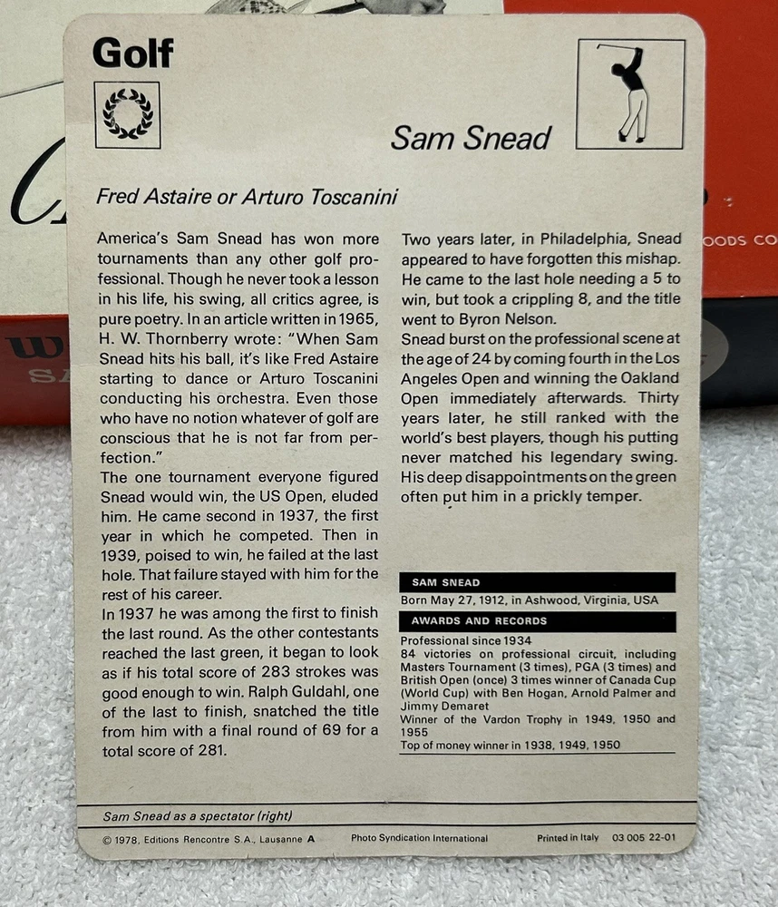 Size:standardTeam:PgaUPC:does not applyCountry/Region of Manufacture:United StatesColor:Multi-ColorSport:Golf-PGAEvent/Tournament:Usga pgaModified Item:NoOfficially Licensed:Yesgtin13:does not applyCapacity:Not applicableBrand:WilsonGender:Unisex AdultProduct:GolfBallPlayer:Sam Snead