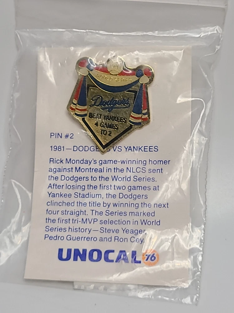This vintage pin is a must-have for any Los Angeles Dodgers fan. Featuring the iconic team logo and commemorating the 1981 World Series matchup against the Yankees, this pin is a true collector's item. It is officially licensed, original, and has been well-preserved over the years, making it an excellent addition to any sports memorabilia collection. The pin is made by Unocal and is part of the SGA collection. It is a great find for vintage sports enthusiasts and is sure to spark conversation. Don't miss out on the opportunity to own a piece of baseball history.