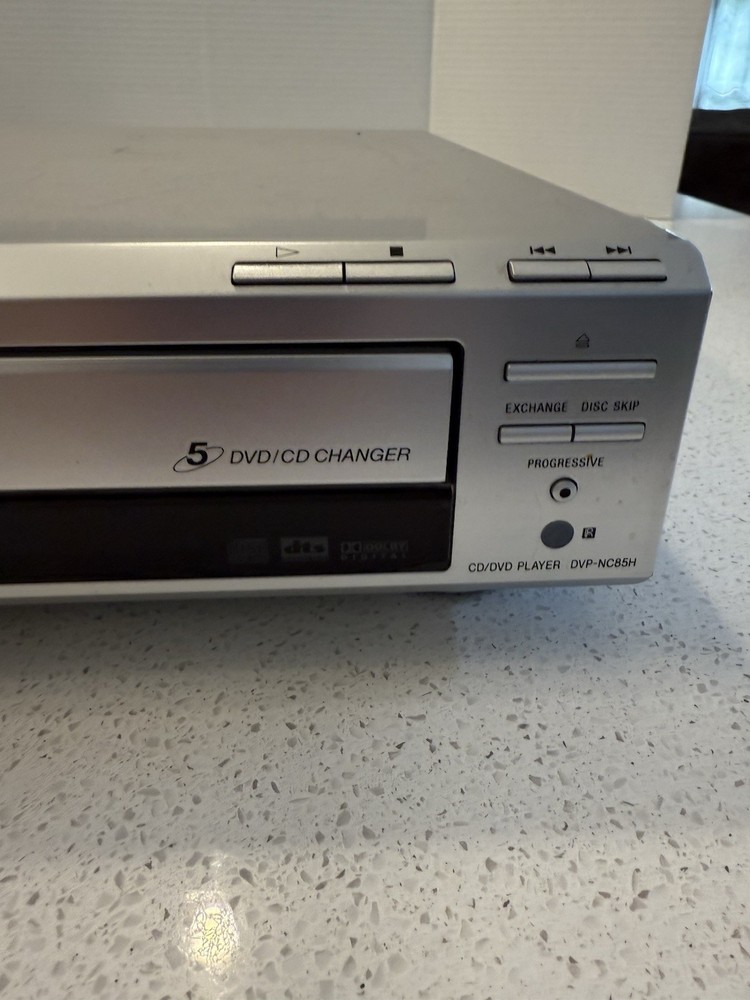 The Vintage Sony DVP-NC875V 5-Disc DVD/ CD/ Super Audio CD Player is a versatile and high-quality DVD player that allows you to enjoy a variety of media formats, including CD, DVD, MP3, and more. With its sleek silver design and digital display technology, this unit is both stylish and functional. Featuring connectivity options such as digital audio, video, and stereo audio outputs, you can easily integrate this DVD player into your home entertainment setup. The inclusion of SACD technology adds an extra layer of audio quality to your listening experience. This 2001 model from Sony is a reliable and sought-after piece for any collector or audio enthusiast.