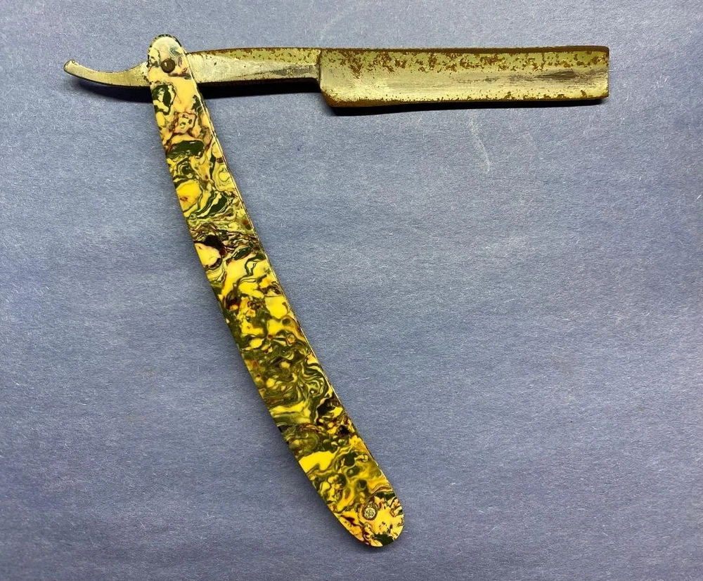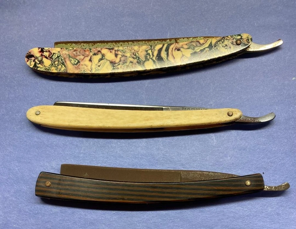 These 3 razors are in various conditions. "Extra Hollow Ground Sheffield" has nice scales with some rust on the blade. "Light Werk Solingen Germany Magnetic Blue Steel" has one good scale and one with an area of roughness along with some rust on the blade. "Royal Blue" has nice scales and some blade rust. Please see the photos for more details. Thanks for taking a look.