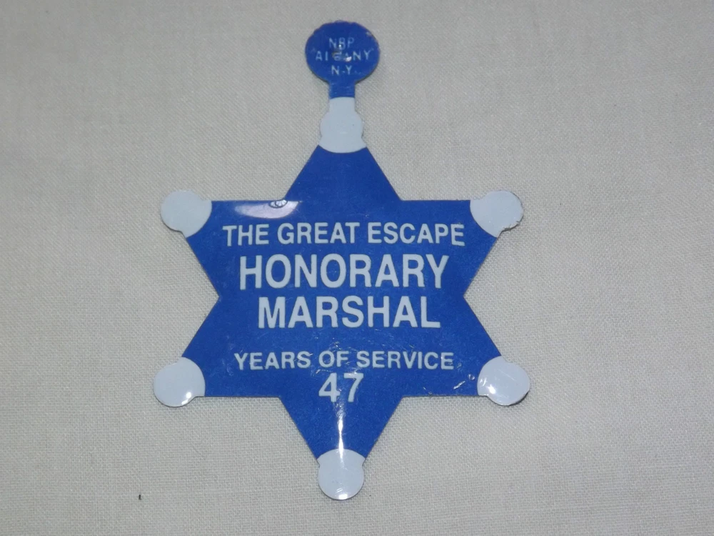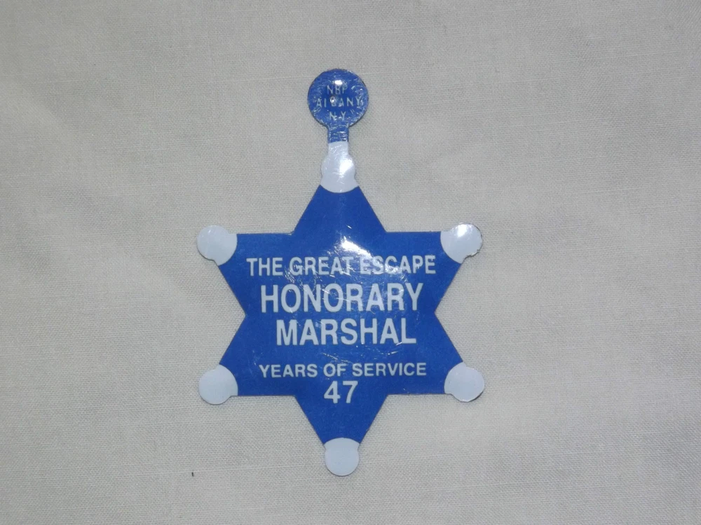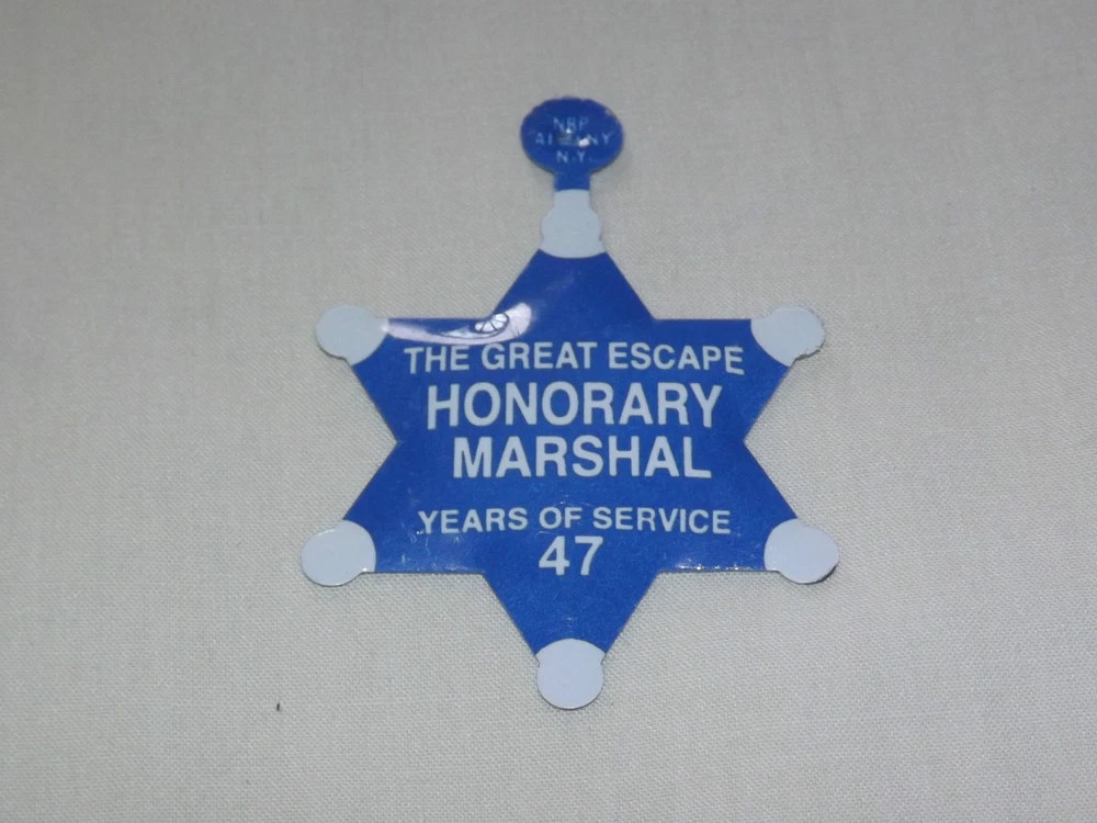 YOU ARE BIDDING ON...... VINTAGE THE GREAT ESCAPE ( FORMERLY STORYTOWN) 47 YEARS OF SERVICE MARSHAL TIN TOY BADGE.... ...MEASURES APPROX 1 3/4" ACROSS...NEVER WORN BUT DOES HAVE A FEW LIGHT SURFACE SCRATCHES FROM HANDLING... THIS ITEM WAS GIVEN OUT BY WILD WINDY BILL McKAY IN GHOST TOWN LAKE GEORGE NY.....PLEASE VIEW PHOTOS FOR CONDITION.***PLEASE E-MAIL IF YOU HAVE A QUESTION OR WANT AN ADDITIONAL PICTURE....PLEASE VISIT MY EBAY STORE FOR ADDITIONAL VINTAGE ITEMS..THANK YOU**12Usftp