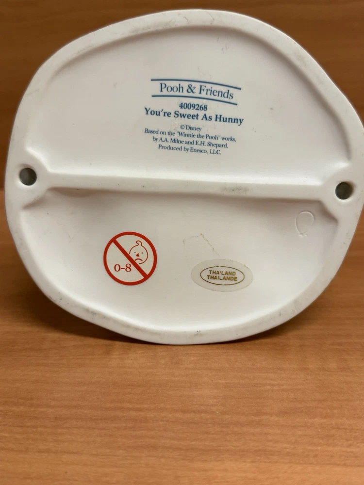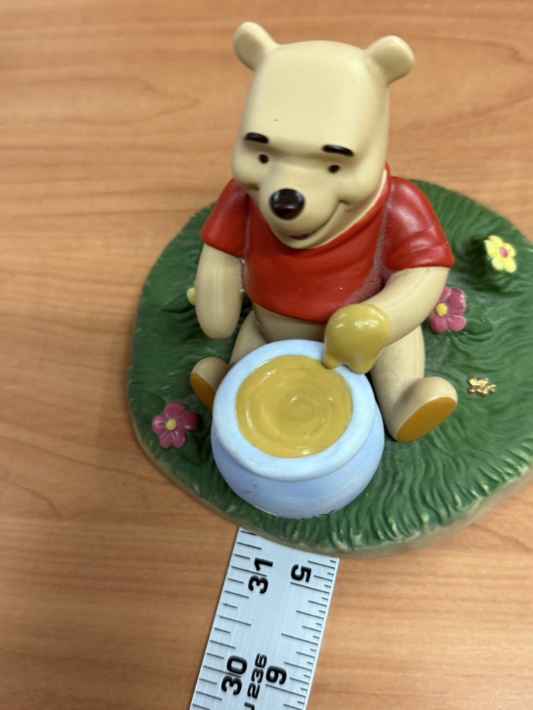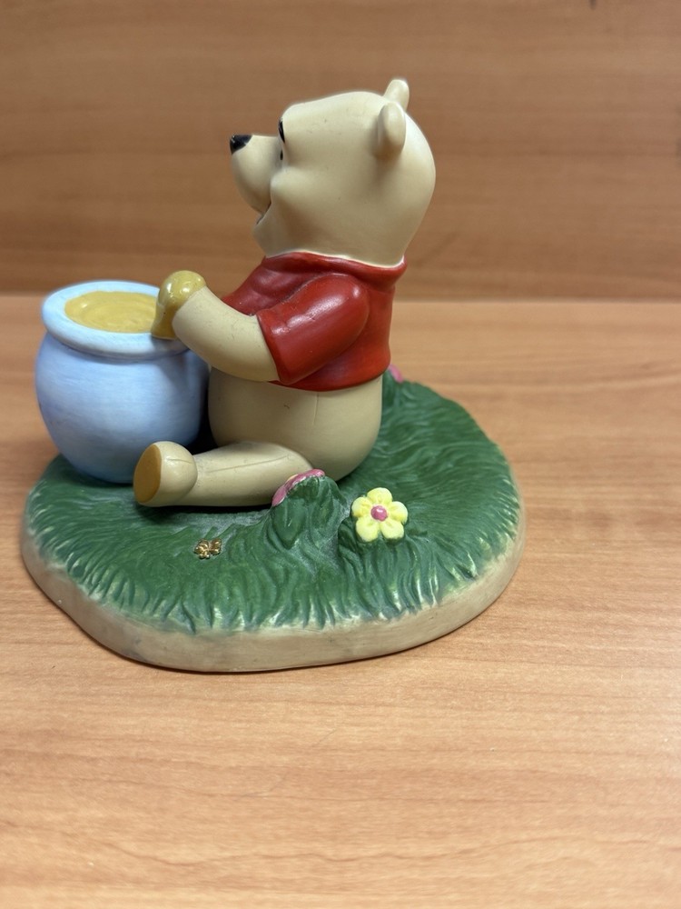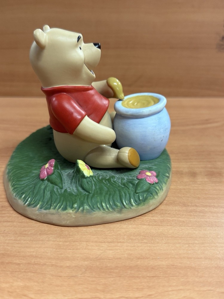The collectible depicts Winnie the Pooh enjoying his favorite treat, honey, from a pot labeled "HUNNY". This piece is part of the "Pooh and Friends" collection by Disney. The honey dripping from the pot and Pooh's paw is made of glistening resin. It was a 1996 membership sculpture from the Walt Disney Classics Collection. The figurine stands approximately 4 3/4 inches tall. **** no box ******