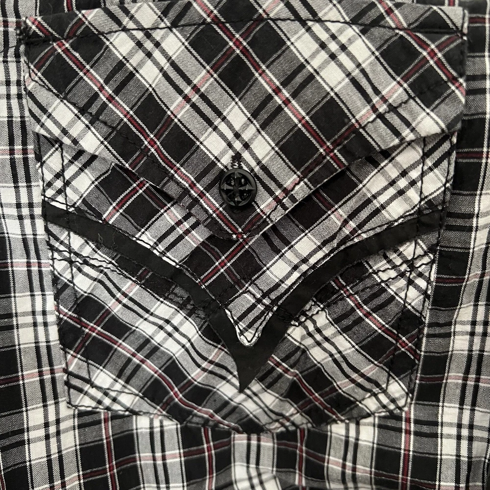 This vintage Affliction Black Premium button-up shirt is a must-have for any fashion-forward man. The collared neckline and long sleeves make it perfect for a variety of occasions, from casual to formal. The classic black and burgundy color and embroidered accents add a touch of edginess to the shirt, while the cotton fabric ensures both comfort and durability. With a chest size of 46 inches and a size of XL, this shirt fits true to size and is machine washable for easy care. The shirt's theme is inspired by motorcycle culture, with elements of Y2K, punk, grunge, and steampunk. This shirt is sure to make a statement and is perfect for any season, whether it's winter, summer, fall, or spring. Add this unique shirt to your wardrobe today! Size: XL Measurements: 23" x 29"