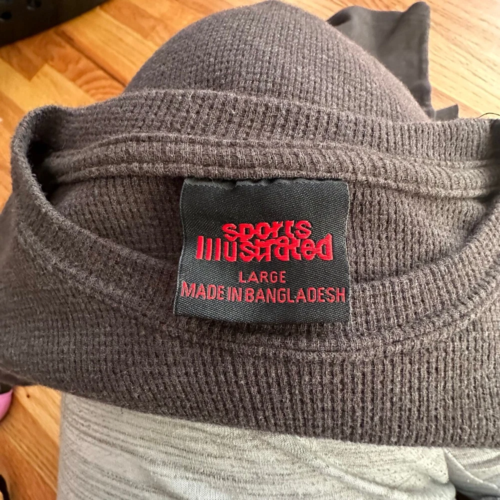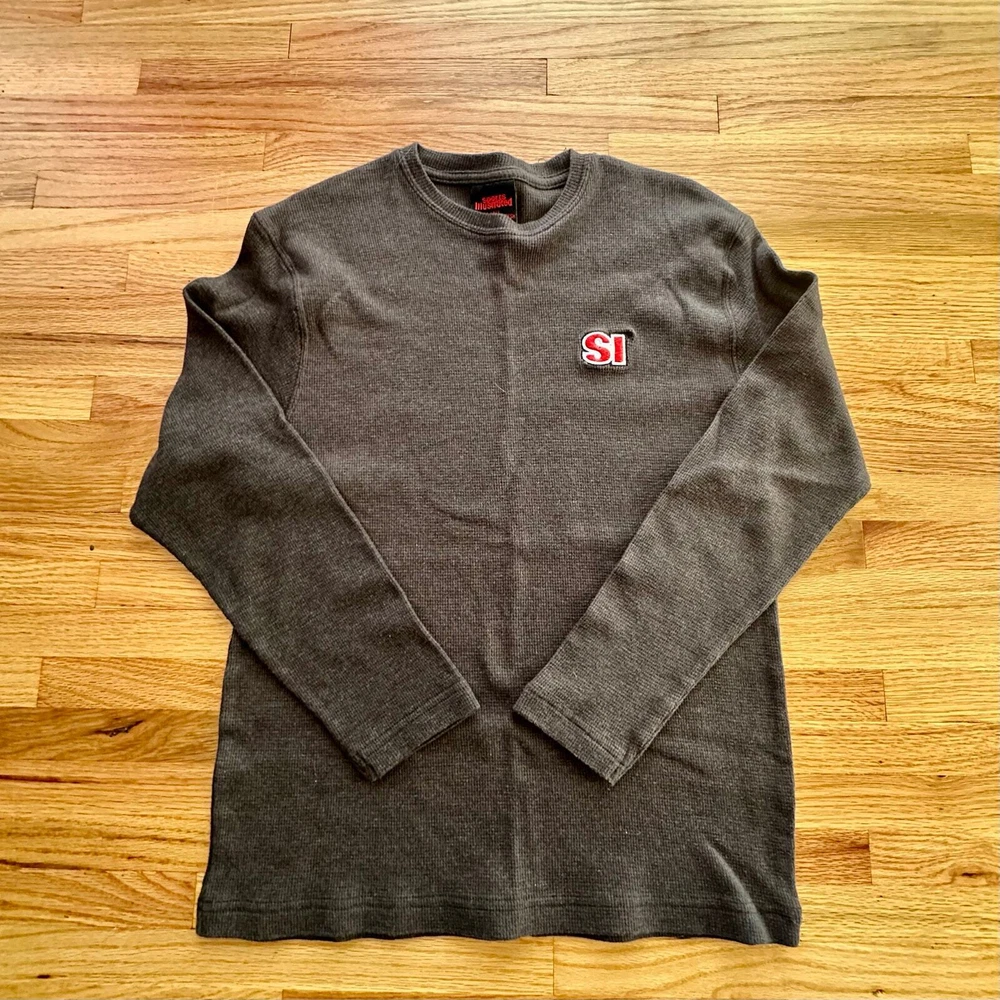VINTAGE x SPORTS ILLUSTRATED Shirt Dark Gray Long Sleeve Waffle Knit Unisex SZ L l Measurements approximate and on flat surface: P2P: 16", Length: 24". l Meant as a L for Juniors or a small for women and a xs for men.