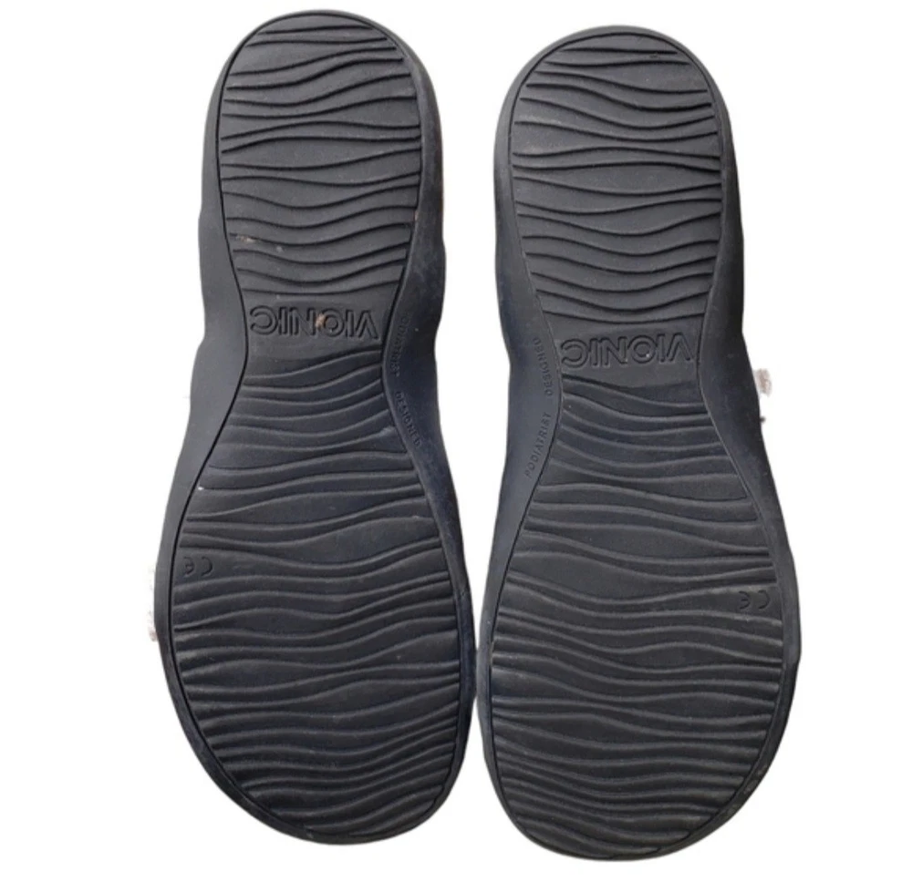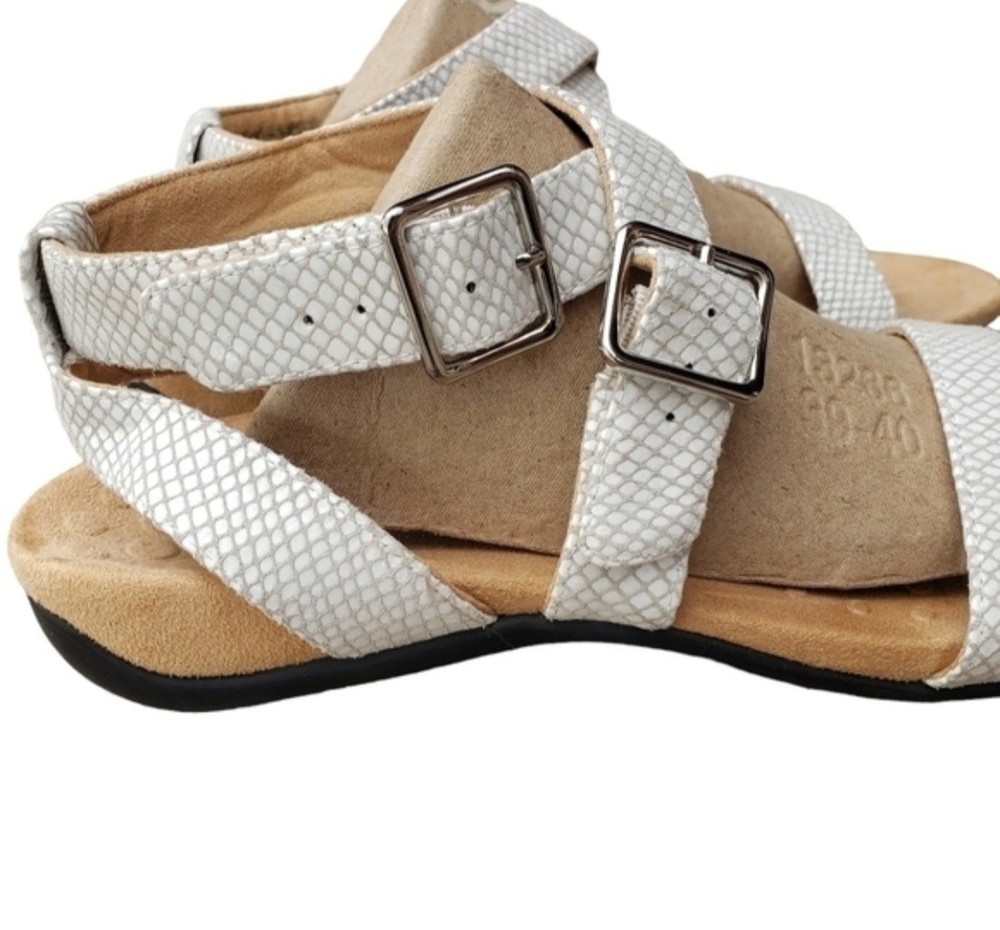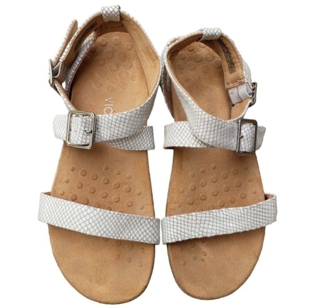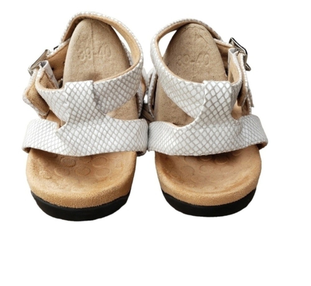 Women's Vionic, Elnora Sandals. Update your summer look with these comfortable and contemporary look!. Leather upper Adjustable buckle straps for a secure fit Podiatrist designed, biomechanical orthotic footbed with FMT technology FMT technology features a built in arch support and deel heel cups to help stabilize the instep and align your feet to their natural position 1 1/2 inch heel Manmade outsole Good Used Condition!