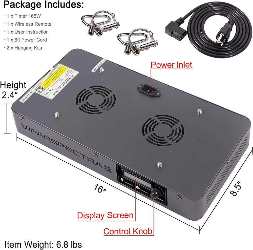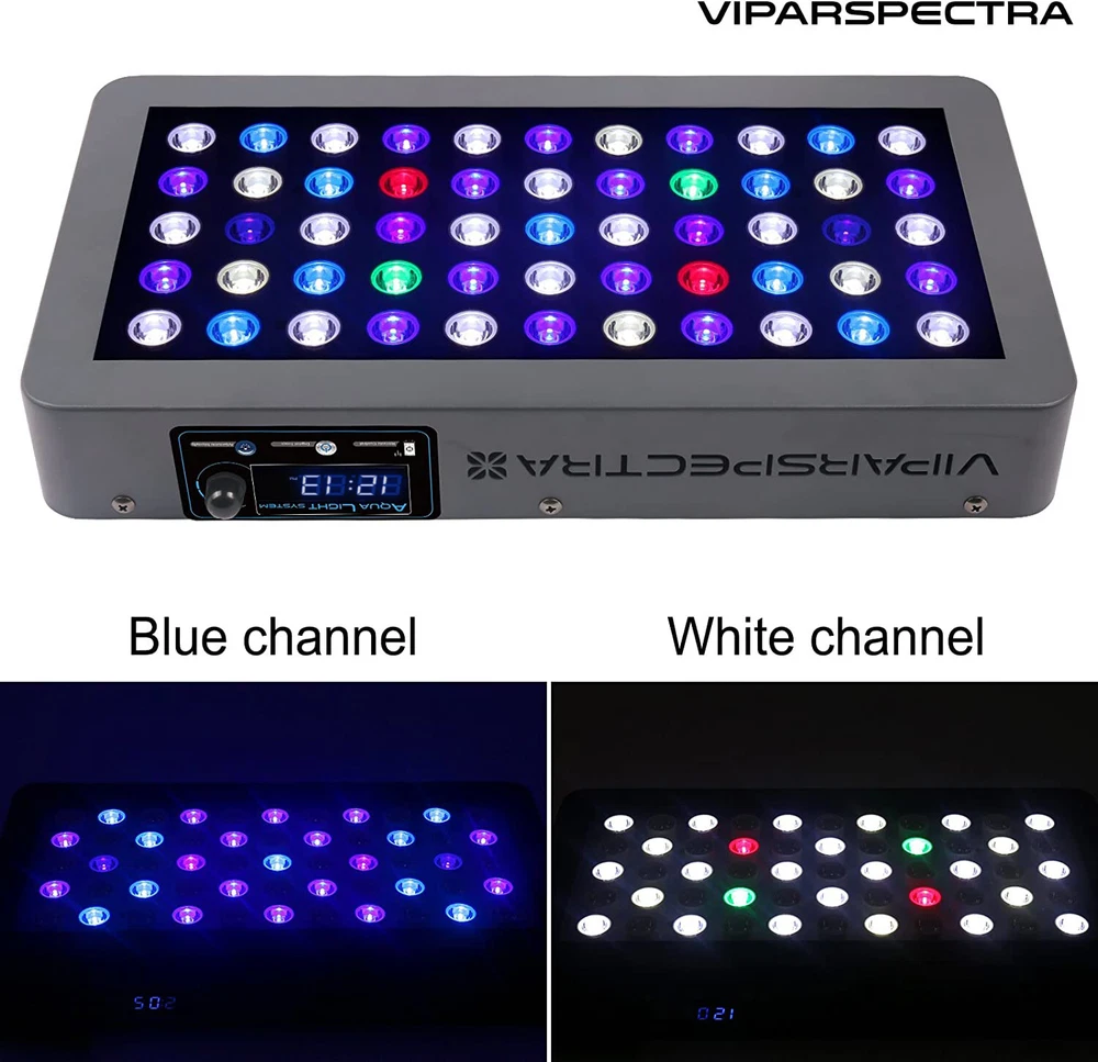 Timer 165W Led Aquarium Light Specifications: - Dimension:15.8x8.3x2.4 inches - Weight: 6.8 lbs - One light is ideal for 24x24x24” tank - Max Coverage at 8" Height: 30x24” - Core Coverage at 8" Height: 24x24” - LED Quantity: 55pcs 3W LEDs - Channel one: Violet/Indigo(420nm), Royal Blue(450nm), Blue(470nm) - Channel two: Green(520nm), Red(660nm), Neutral White(6500K), Cool White(12000K) - Actual Power Consumption: 105W±3% - LED Brand: Bridgelux/Epiled - Lifespan: 100,000 hours - Secondary LED Focusing Lens 90° - Cooling system: quiet fans and heat sink - Input Voltage: AC100-240V - Frequency: 50-60Hz VIPARSPECTRA Timer Control 2pcs 165W LED Aquarium Light For Coral Reef Fish Tank The V165 165W LED Aquarium Light on eBay platform was updated to the new version from February 6th, 2024. The intensity interval of the new version is 1%, while the old version is 10%. Welcome to the VIPARSPECTRA Timer Control Series Dimmable V165 165W LED Aquarium Light, with full spectrum layout, built in timer, dimmable ability and advanced heat dissipation system, specially designed to provide perfect lighting environment for all your precious water creatures. Features: - VIPARSPECTRA Timer Control Series V165 LED Aquarium Light is scientifically engineered to keep the balance of the PAR output and coverage. - Internal timer allows you to turn the light on or off automatically and separately. Dimmable feature can be used to adjust two channels brightness individually. - V165 is full spectrum with our proprietary layout, which is contributed by thousands of ReefCentral members, has had years of success. - Suitable for all photosynthetic corals, be sure to acclimate your tank or new corals to the new light by slowing increasing its exposure/intensity to the light. - 1 year local warranty plus 30 days satisfaction or return guarantee. Timer 165W Specifications: - Dimension:15.8x8.3x2.4 inches - Weight: 6.8 lbs - One light is ideal for 24x24x24” tank - Max Coverage at 8" Height: 30x24” - Core Coverage at 8" Height: 24x24” - LED Quantity: 55pcs 3W LEDs - Channel one: Violet/Indigo(420nm), Royal Blue(450nm), Blue(470nm) - Channel two: Green(520nm), Red(660nm), Neutral White(6500K), Cool White(12000K) - Actual Power Consumption: 105 W±3% - LED Brand: Bridgelux/Epiled - Lifespan: 100,000 hours - Secondary LED Focusing Lens 90° - Cooling system: quiet fans and heat sink - Input Voltage: AC100-240V - Frequency: 50-60Hz Design: - Built-in-Timer with two on/off settings one for blue and the other one for white. - One remote in hand, everything is simple. - Two channels brightness can be adjusted from 0% to 100% separately, interval 1% . - Full spectrum that mimic natural light to help corals/fish achieve the best balance. - Advanced high speed quiet fans and upgraded aluminum heat sinks are easy for heat dissipation. - Easy adjustable hanging kits. Package includes: ·2 x Timer 165W ·2 x Wireless Remotes ·2 x User Manuals ·4 x Hanging Kits ·2 x 6ft Power Cords (US Standard 110V grounded 3 prong plug) Attention please: - Indoor use only, not water-proof. No extra ballast is needed. APEX does not currently support this product. - Can not program sunrise, sunset and moonlight. - Can not be daisy chained. - Does not have a shimmering/ storm effects mode setting. - Can not set up multiple lights by one remote at the same time, have to do it separately. - 1 year US local warranty and 30-day money back guarantee. Payment Delivery details Ruturns Feedback Contact us Payment 1. We only accept payment by PayPal. PO. BOX Not Acceptable. 2. Please make payment within 7 days. If you don't need it, please inform us to cancel it, for eBay will open UNPAID dispute automatically in eighth day. 3. Paypal allows you to complete your purchase quickly and securely. It offers a variety of payment options including all the major card carriers. Delivery details 1. We will ONLY ship item to eBay physical Paypal address. Your eBay address must match Paypal address. 2. Monday-Friday. All orders will be shipped within one working day after payment. 3. Tracking number will be upload on ebay within 24 hours after shipment. 4. Shipping Time: 3-6 working days for US buyers. 5. To US buyers: for the led grow lights over $250 . We will send by Signature Service . Customer who inconvenience to sign for the package, please leave us a note when you place order. If customer's community is not very safe for post man delivered package when no one at home, customer can leave us a note to require signature service, we will send by signature to you for any item. Ruturns 1. Please kindly CONTACT US via eBay message if there is any problem, instead of Open Case or Return Requests, We will always try our best to solve the problem for you. 2. We provide a 30 days satisfaction or return guarantee for exchange or refund. Return shipping and handling is responsibility of the buyer. 3. The package must be in its original packaging and include all of the original accessories or items that came with it when returning an item. The item and package should be in original and perfect condition. Feedback 1. We are really appreciated that all the customers can give us 5-star positive feedback. 2. Please don't give us neutral and negative feedback before contacting us. Don't forget that good communication can solve all problems. Any questions, please feel free to send message to us first. 3. Please remember we are always here to serve you and ensure you a happy shopping experience. Contact us 1. We work from 9:00am. to 18:00pm.(GMT+8) of Monday to Friday . 2. If you have any questions, please message us and give us a chance to assist you. All messages will be answered within 1 business day (except Public holidays in China).
