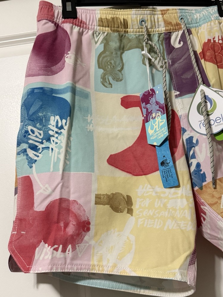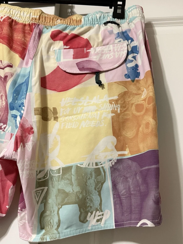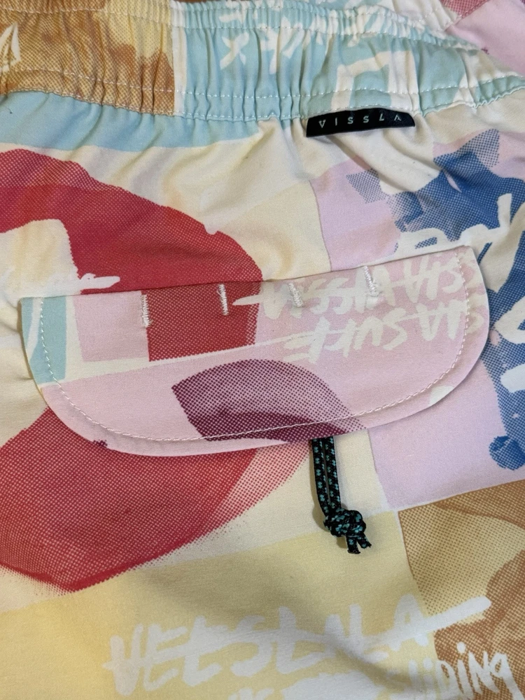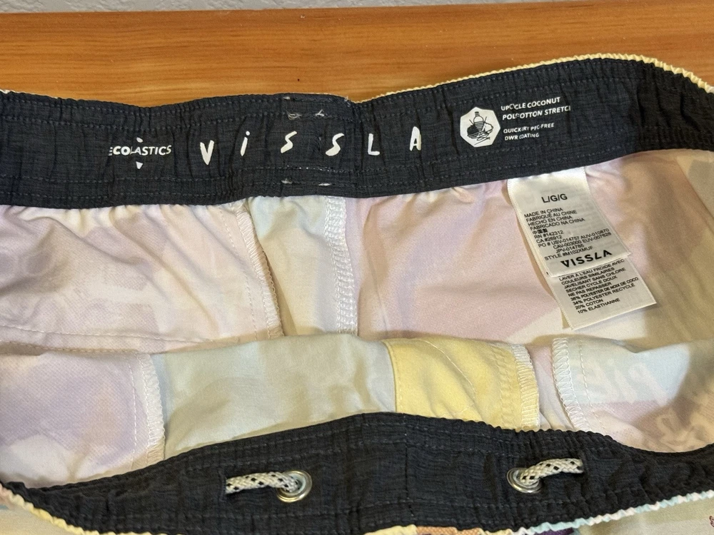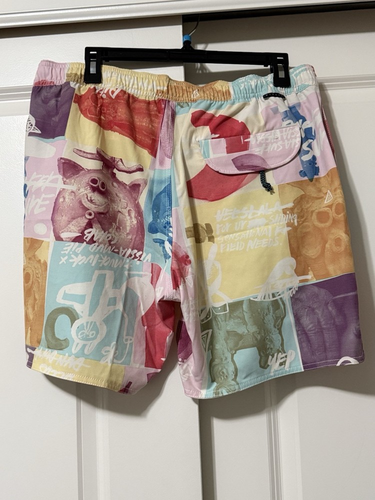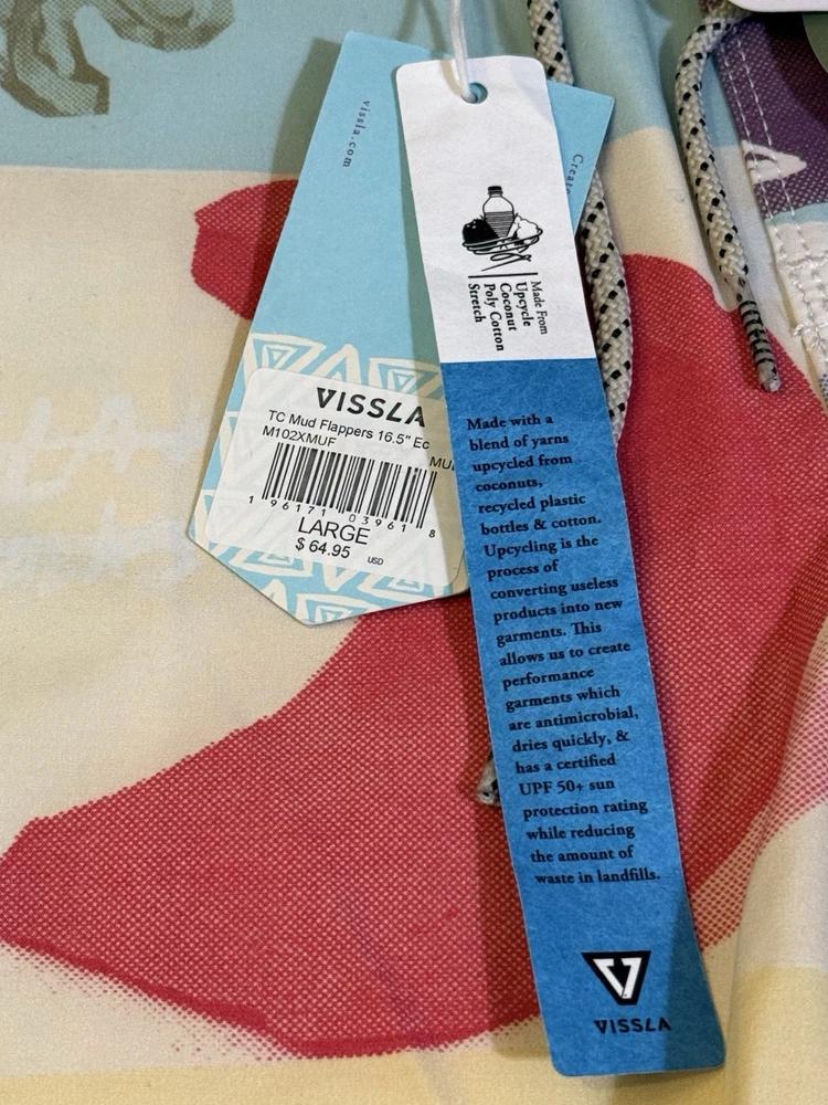 Make a splash with these colorful Vissla board shorts! Designed with an elastic waistband, these shorts offer both comfort and style for any beach activity. The multicolor design and beach theme make them perfect for surfing or recreational use. These shorts are made in China and come in a size Large. The Vissla brand is known for their high-quality swimwear, and these board shorts are no exception. They are perfect for any man who wants to look great while hitting the waves. The swim bottom style is a board short, and they feature an elastic waistband for a comfortable fit. These shorts are lined, but the lining material is not specified. The TC MUD FLAPPERS 16.5 style adds a unique touch to these shorts, making them a must-have for any swimwear collection.