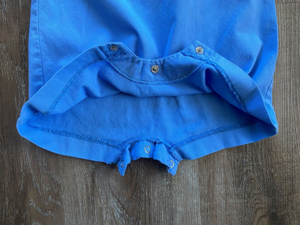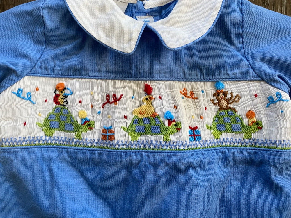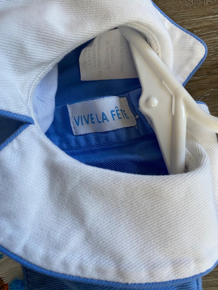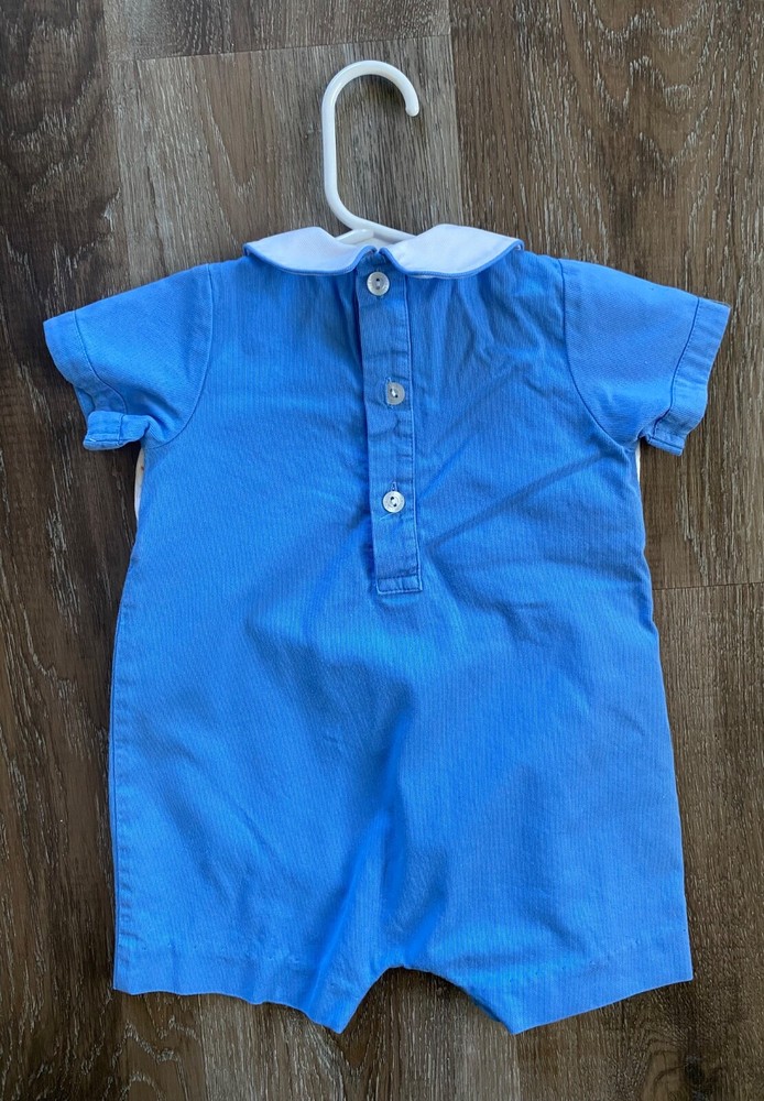 VIVE LA FETE Birthday Party Smocked Romper~Size 6 Months Infant's VIVE LA FETE smocked romper *Size: 6 months *Fabric content: cotton blend *Peter Pan collar *Color: blue, & white with a multicolor embroidered pattern on the chest *Closure: 3 snaps in the crotch and 3 buttons on the back *Chest: approx. 10.5 from side seam to side seam *Length: approx. 16 inches from top of shoulder seam to leg hem *Sleeves: approx. 3.5 inches ling from top of shoulder seam to hem *Condition: Excellent, pre-owned condition. NO stains, rips, or tears. *We have a smoke-free home.
