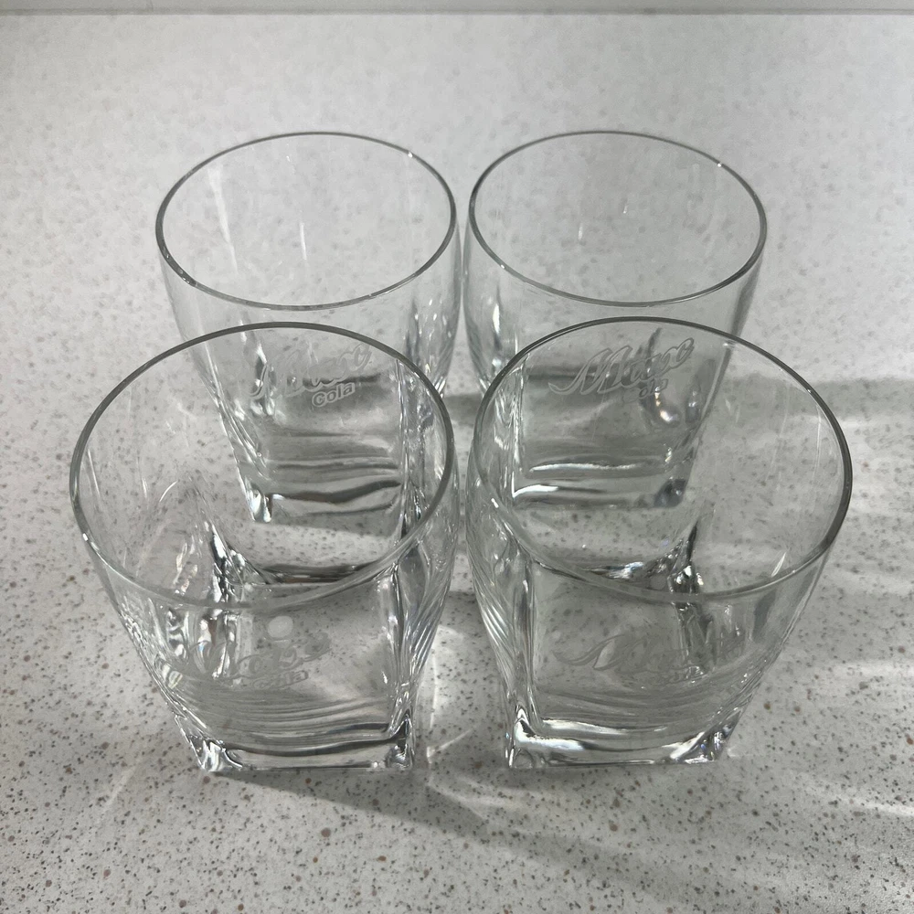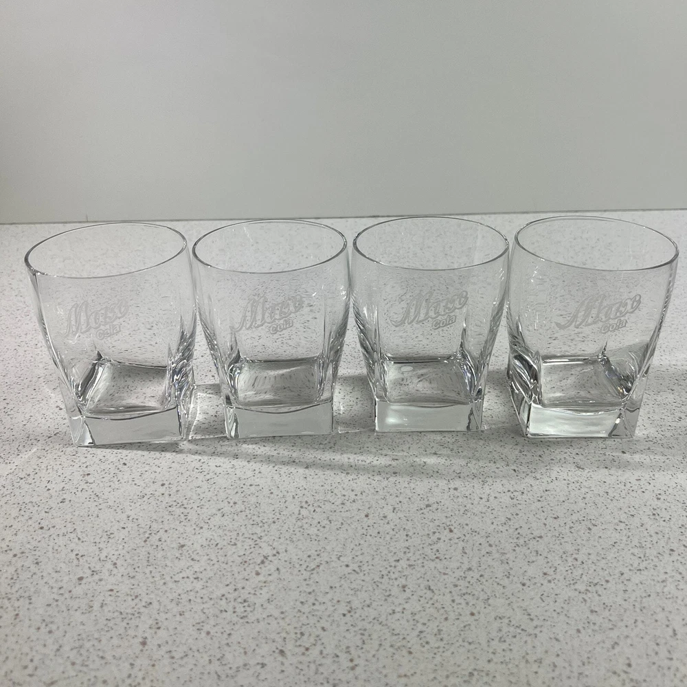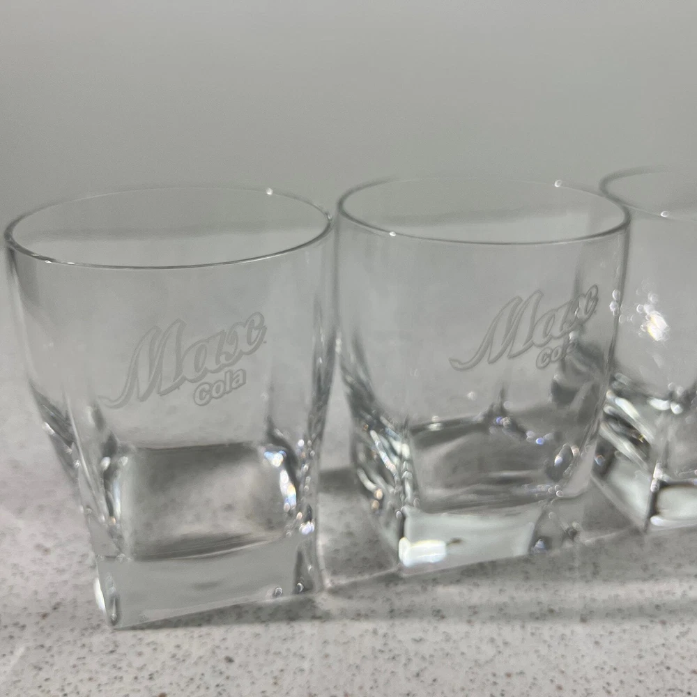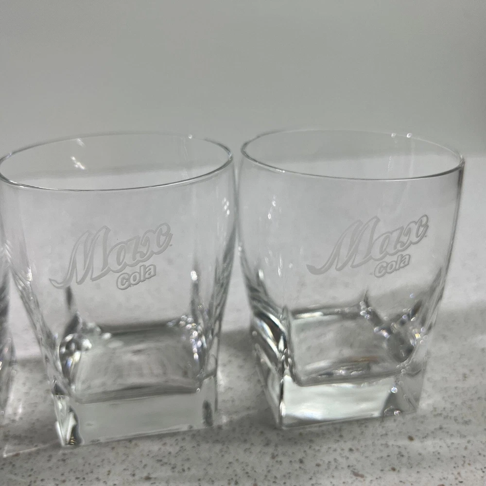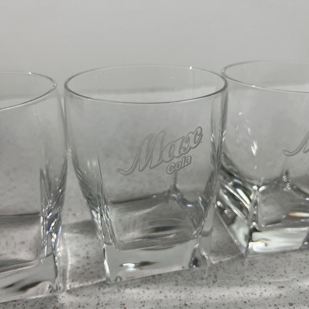 VIntage Albertsons Max Cola Lowball Rock Drinking Glasses Rare Promo Store Item Max Cola promotional items - glasses were given to Max Grocery store managers in the 90s Clear glass with etched logo. Round rim tapers to square bottom About 4" tall - 3.25" diameter Great condition - no chips or cracks. Never used - just as a display item. We are a smoke-free and pet-friendly environment! 2308