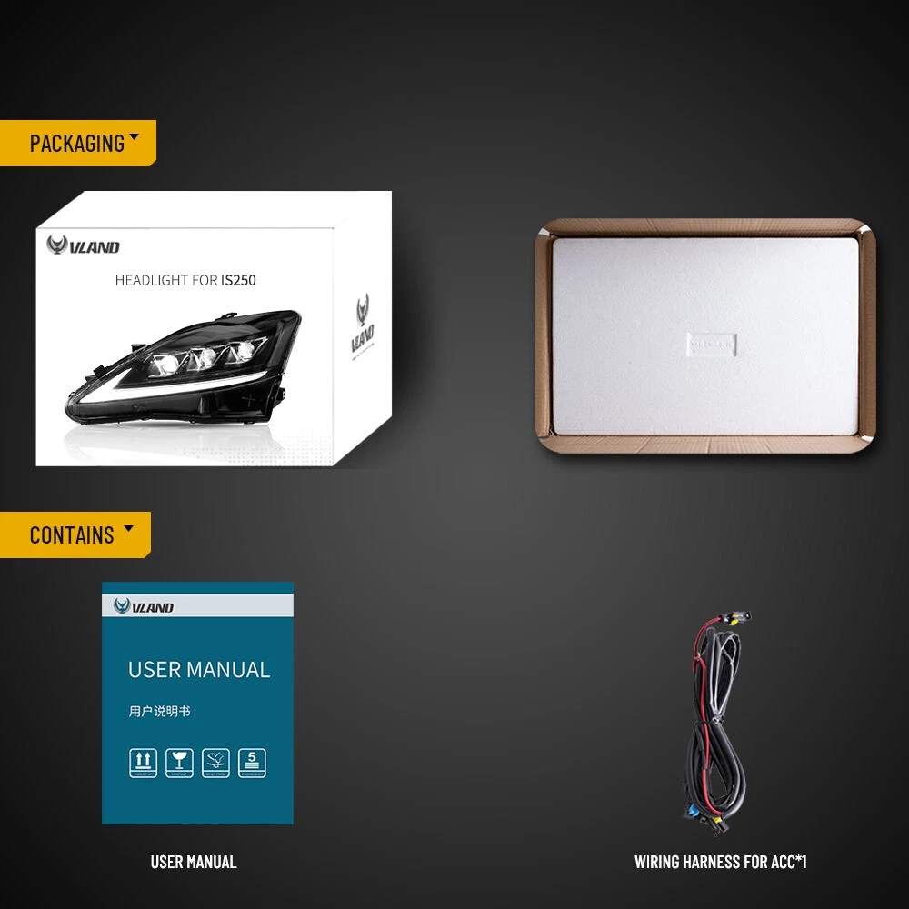VLAND FULL LED Headlights Assembly For 2006-2013 Lexus IS250 IS350 ISF Sedan Part #: 9098120020, 90981-20021, 9098120021, 81126-53240 INCLUDES: (1) Front Headlight Assembly Right Passenger Side (1) Front Headlight Assembly Left Driver Side Fitment: 2006-2013 Lexus IS 250 350 ISF ( Professional Installation is Highly Recommended. ) Contact Us SHIPPING & RETURN WARRANTY Contact Us 100% satisfaction goal. If you have had less than 100% positive experience, please contact us, so we can work out a resolution. Your questions will be replied within 24 hours except the weekend and holiday. We will serve for you with all sincerity! SHIPPING & RETURN Shipping Information - Policy The goods will shipped by the eBay address, so please leave the right address on eBay Please, choose some local sellers, If you cannot wait patiently in the shipping time we declared. Once you purchase, please DON’T leave negative or neutral feedback if you haven't received item in 30 days, because we have mentioned the shipping time repeatedly. If you not satisfied with the goods please contact us before leave the feedback, we will try ourbest to satisfy you. Standard Order Processing time: W e'll update you when proceeding with your order from (Monday - Friday). Payment cleared/received on Friday will be shipped on the next business days (Monday or Tuesday). We are not responsible for carrier transit time. This information is provided by the carrier and excludes weekends and holidays. Note that transit times may vary, particularly during peak periods or in climate weather conditions, and that delivery times frames will need to be extended for any processing time frames in excess of 2-3 business days. WARRANTY Standard Replacement Specifically excluded from this warranty are failures caused by misuse, negligence, modification, abuse, improper application, installation or operation, or by unauthorized service or use of unauthorized parts in connection with the product and inadequate maintenance, normal wear and tear or normal consumption of the product. One time replacement Customers are responsible for the return shipping cost on warranty claims. We will refund you the money you paid for the parts less shipping and handling charges Please Note: - We also have more models available, please contact us if you can't find your specific model. - When products are noted in the description as out of stock, these products will then be offered as pre-sale items, normally they will be posted within 20 days from the date of cleared payment. - Item sold in a pair (left and right), bulbs may or may not be provided. On Dec 18, 2024 at 01:52:52 PST, seller added the following information: