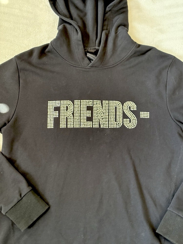 Fit:RegularAccents:RhinestoneMaterial:CottonPerformance/Activity:WalkingFabric Type:FleeceStyle:PulloverBrand:FriendsVintage:NoType:HoodieGarment Care:Machine WashableDepartment:MenSeason:WinterFeatures:HoodedPattern:SolidClosure:HoodedSize:MColor:BlackSleeve Length:Long SleevePersonalize:NoSize Type:RegularCountry of Origin:United States