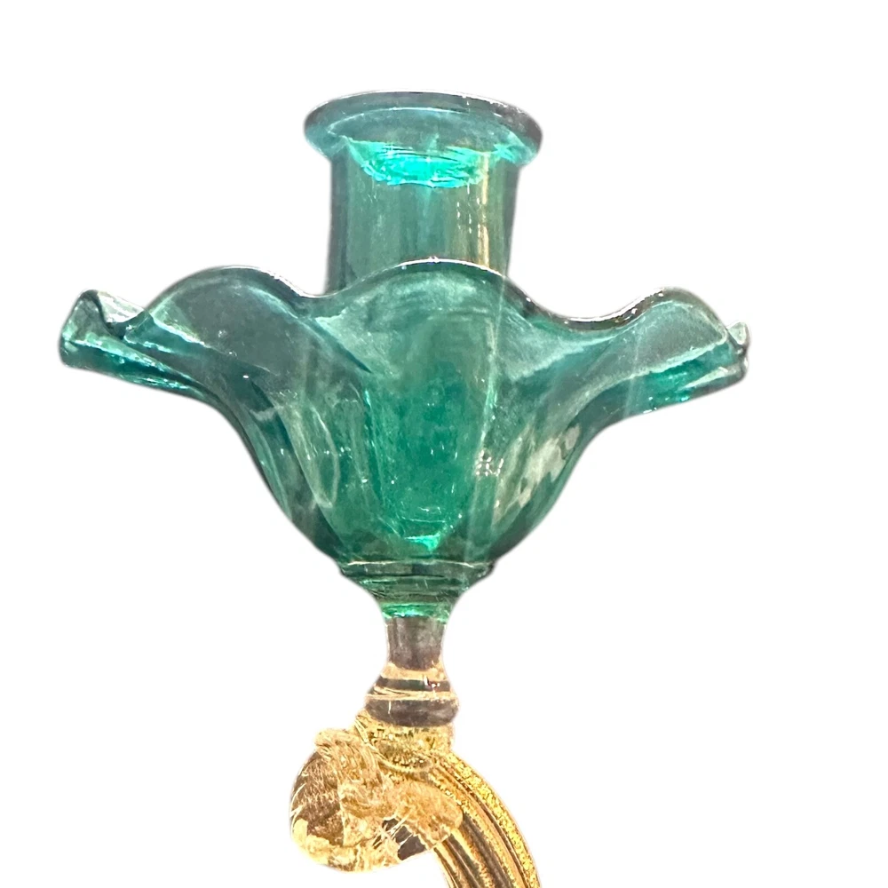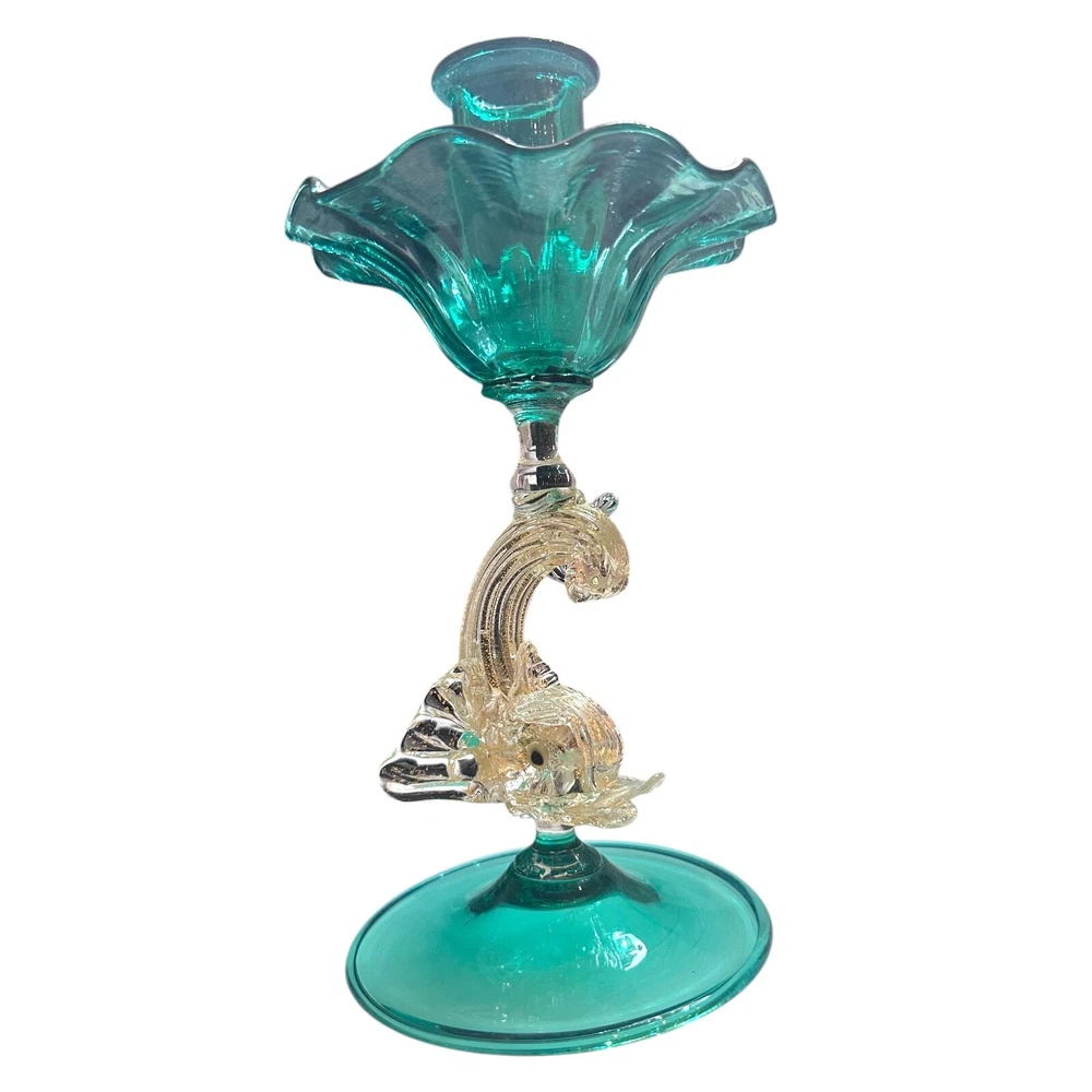 Vintage Murano Green Venetian Art Glass Figural Dolphin Candlestick originating on the Venetian Island of Murano is Vetreria Artistic La Fenice di Albertini created by Gianfranco Albertini. Candlestick measures 5ʺW × 5ʺD × 8.75ʺH and employs bright green glass symbolizing the Grand Canal waters. Dolphin is made with gold dust inclusions known as Aventurine. History Major Vintage provides a reliable, honest, and transparent experience for our buyers. We've endeavored to describe all items to the best of our knowledge. We're collectors, buyers and sellers who ship fast at a low cost to our customers. Most items are cleaned before being photographed and listed. Please don’t hesitate to contact us with any comments, questions, concerns or corrections. We love hearing from you!