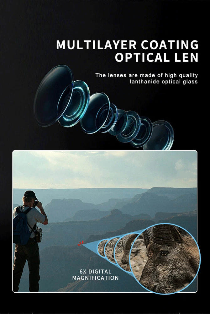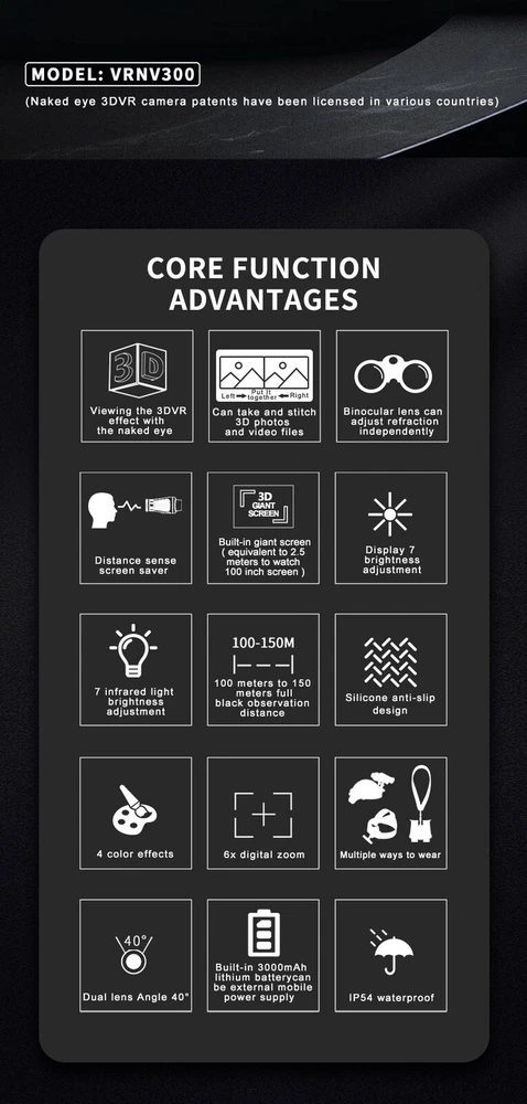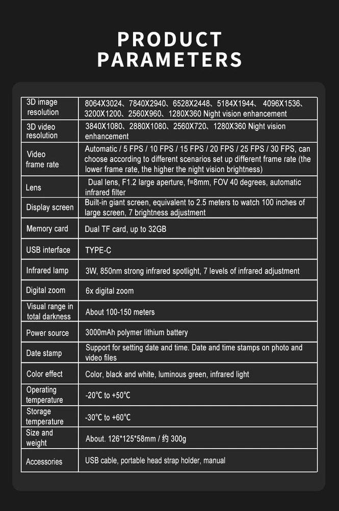Specifications: 3D image resolution :8064x3024, 7840x2940, 6528x2448, 5184x1944, 4096x1536, 3200x1200, 2560x960, 1280x360 night vision enhancement 3D video resolution :3840x1080, 2880x1080, 2560x720, 1280x360 night vision enhancement Video frame rate: automatic / 5 FPS / 10 FPS / 15 FPS / 20 FPS / 25 FPS / 30 FPS, can choose according to different scenarios set up different frame rate (the lower frame rate, the higher the night vision brightness) Lens: Dual lens, F1.2 wide aperture, f=25mm, FOV 32 degrees, automatic infrared filter Display: Built-in giant screen, equivalent to 2.5 meters to watch 100 inches of large screen, 7 brightness adjustment Memory card: Dual TF card, up to 32GB USB port :TYPE-C Automatic shutdown: Off /1 minute / 3 minutes / 5 minutes / 10 minutes Infrared light :3W, 850nm strong infrared spotlight, 7 levels of infrared adjustment Distance screen saver: The screen is turned on when viewing near the eyepiece, and the screen is turned off when leaving the eyepiece to save power Visual range in total darkness: about 100-150 meters Low light visual distance :1.5 m ~ infinity Digital zoom: 6x digital zoom Color effects: color, black and white, luminous green, infrared light Power supply :3000mAh polymer lithium battery Language: Multiple languages are available Date stamp: Supports setting date and time. Date and time stamps on photo and video files Operating buttons :11 buttons Operating temperature :-20℃ to +50℃ Storage temperature :-30℃ to +60℃ Size and weight: Approx. 126*125*58mm/TDB g Features: ♦ Binocular binocular naked eye 3DVR technology, restore the real stereoscopic scene seen by the human eye (naked eye 3DVR camera patent has been authorized in various countries) ♦ 3DVR effect can be viewed, and 3D photos and video files can be shot ♦ Built-in giant screen, equivalent to 2.5 meters to watch 100 inches of large screen, 7 brightness adjustment ♦ Fully independent binocular technology can independently adjust the vision compensation of the left and right eyes (refractive adjustment range +/-4, suitable for vision compensation adjustment of 400 degrees of nearsightedness/farsightedness) ♦ With distance sense screen saver function, the display opens when watching near the eyepiece, and the display switches off when leaving ♦ Small size, light weight, a variety of portable use, strap on the neck, strap portable head wear, tactical helmet head wear ♦100 m ~150 m full black observation distance, 1.5 m ~ infinite weak light observation shooting distance ♦ Built-in 3000mAh lithium battery, rechargeable ♦ High-power infrared light, 7 brightness adjustment ♦4 color effects: color, black and white, moonlight green, infrared light ♦IP54 waterproof rating Main application scenarios: sports events, large-scale concerts, 3D film shooting, tactics, reconnaissance, hunting, security and surveillance, camping fun, wildlife observation, etc. The package includes: Binoculars *1 USB cable *1 Portable headband holder *1 Instructions *1 About Us Payment and Shipping: 1. we only accept PayPal payment. 2. We will ship your order within 5 days. Please make sure your shipping address and phone number are correct. Returns 1. If the item arrives with defects or errors, before you start the return process, please contact us via ebay message and we will provide you with a satisfactory solution. Communication is always the best way to solve problems. 2. If you do not receive your item on time, please contact us for further assistance. Feedback and Contact Us 1. we always try to provide every customer with the best service and the best quality products, but sometimes there may be accidents, if you are not satisfied with our goods or services, please feel free to leave a message to contact us, we believe we can solve all the problems for you. Please do not feel free to leave negative feedback. 2.If you are satisfied with our products, we also hope you can give us a five-star positive feedback. We will be grateful for that. About tariffs 1. Import duties, taxes and charges are not included in the item price or shipping cost, these charges are collected by the customs of your country. Buyers are responsible for paying import duties and taxes themselves, as stipulated by eBay. 2. Please check with your country's customs office before purchasing to determine these additional customs fees.