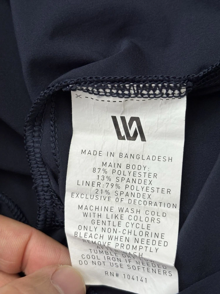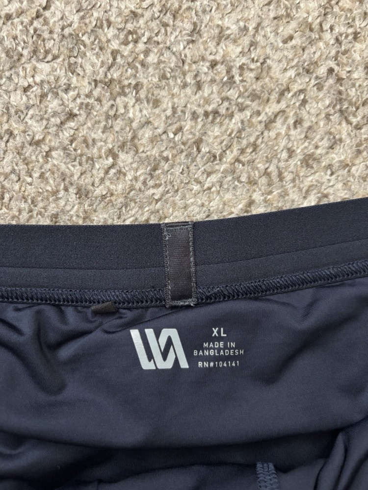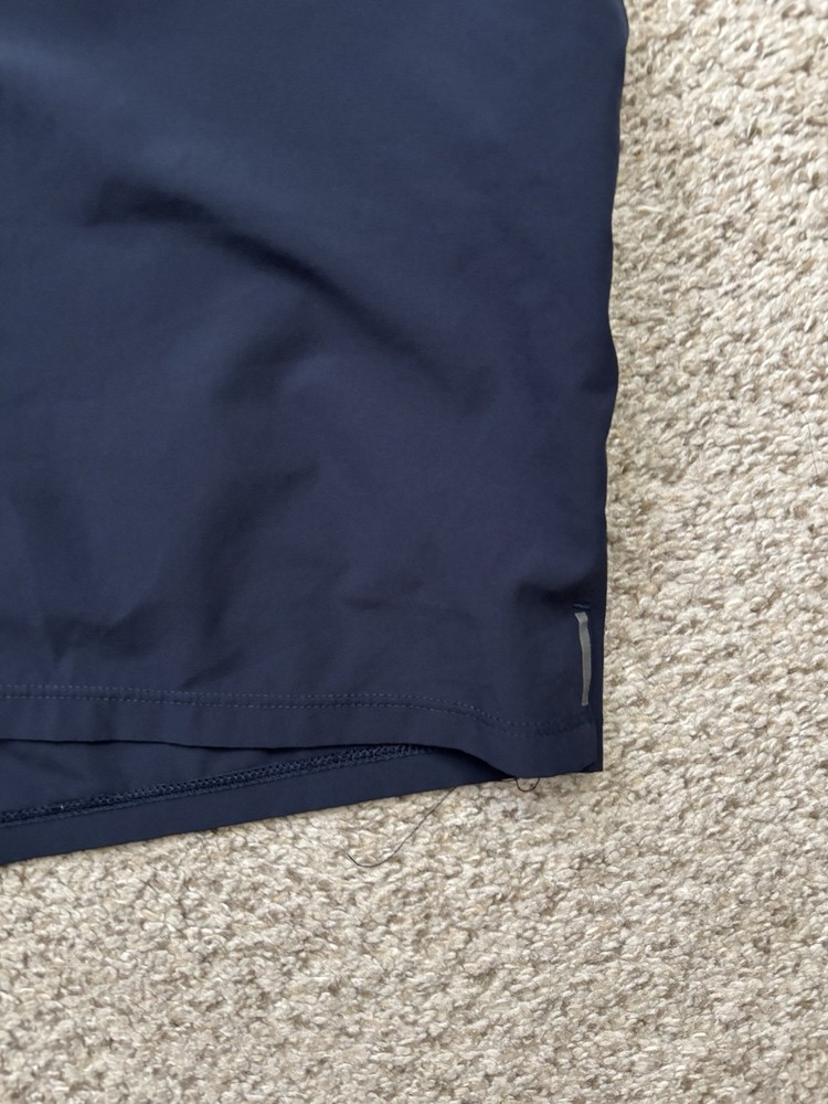 The VRST Shorts for men in size XL are designed for running and other athletic activities. These dark navy blue shorts feature a 5-inch inseam with an elastic waist and drawstring closure for a comfortable and secure fit. Made from a blended fabric of polyester and spandex, they are lightweight, quick-drying, and moisture-wicking, making them ideal for summer, fall, and spring seasons. The reflective details add visibility during low-light workouts, while the solid pattern and athletic style make them suitable for outdoor sports activities. Perfect for gym training and jogging, these shorts are a versatile addition to any activewear collection.