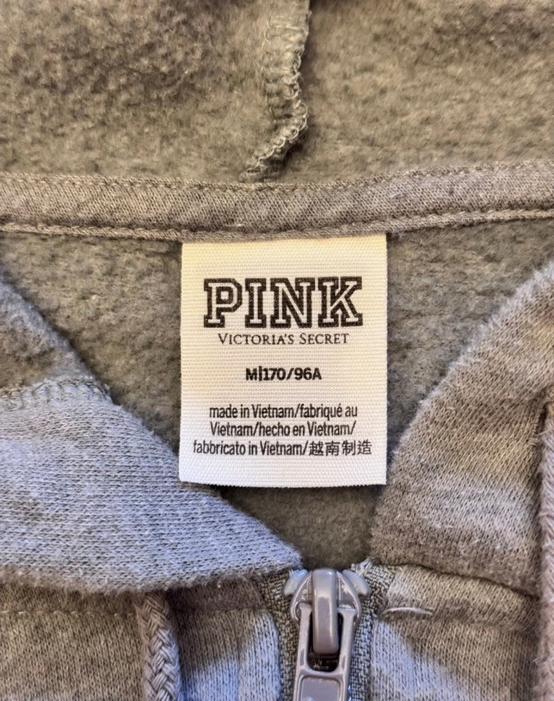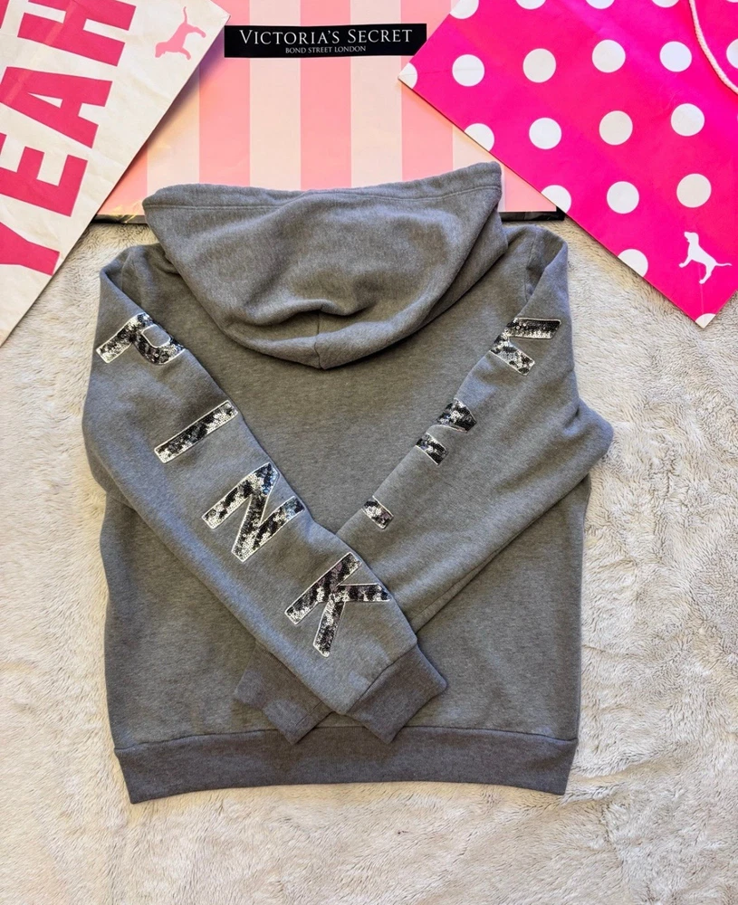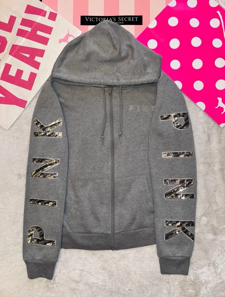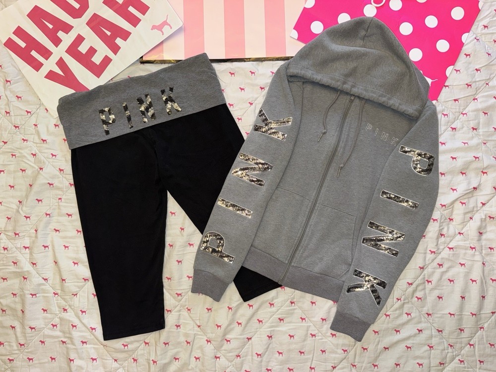 Department: Women Brand: PINK Victoria’s Secret Number of Pieces: 2 Piece Size: M Theme: Zebra Print, Animal Print, Bling, Sequins Material: Cotton Blend Set Includes: Full Zip Hoodie Sweatshirt, Fold Over Capri Yoga Leggings Season: Fall, Winter, Spring, Summer Color: Gray Sleeve Length: Long Sleeve Closure: Zip Type: Outfit/Set Size Type: Regular