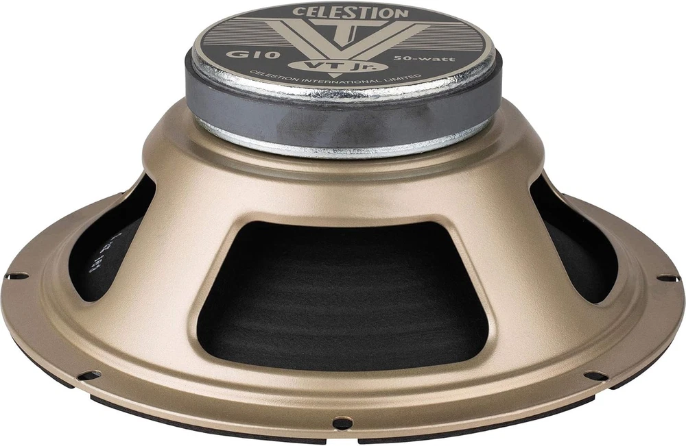 General Specifications : Nominal Diameter (mm) 254mm || Power Rating : 50W || Sensitivity : 95dB || Rated Impedance : 8Ω || Frequency Range : 90-5500Hz || Resonance frequency Fs : 90Hz || DC resistance, Re : 6.78Ω & 12.92Ω || Voice coil diameter (mm) : 44mm || Voice coil diameter (in) : 1.75in || Chassis Type : Pressed steel || Magnet Type : Ceramic || Magnet Weight (kg) : 0.56kg || Magnet Weight (oz) : 20oz || Voice coil material : Round copper Mounting Information : Magnet structure diameter 115mm / 4.5in || Mounting slot dimensions (mm) : 6.5x11mm || Mounting slot dimensions (in) : 0.25x0.43in || Mounting slot PCD (mm) : 245mm || Mounting slot PCD (in) : 9.6in || Number of mounting slots : 8 || Overall Depth (mm) : 93mm || Overall Depth (in) : 3.7in || Cut-out Diameter (mm) : 229mm || Cut-out Diameter (in) : 9.0in Packed Dimensions & Weight : Unit Weight (kg) : 1.6kg || Unit Weight (lb) : 3.5lb Loaded into many popular branded practice combos the VT Jr is now available to buy for replacement and upgrades. Delivering the same balance and musicality as its big brother the V-Type, the 10-inch VT Jr. has been formulated using the same recipe of old and new design techniques. Expect a juicy low mid punch together with plenty of high end sparkle and the same thrilling responsiveness that will leave you feeling connected to your music. CELESTION VT JUNIOR GUITAR SPEAKER